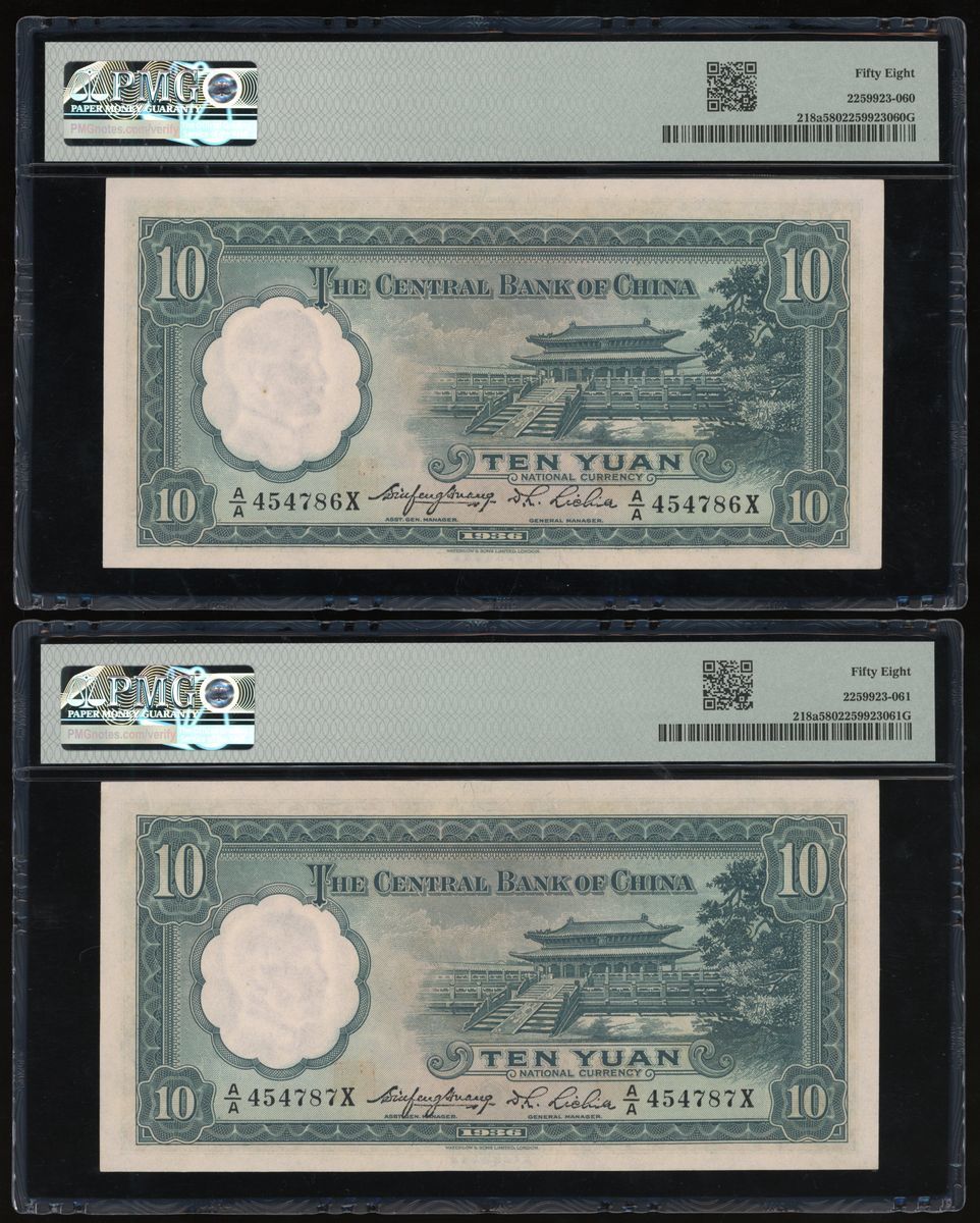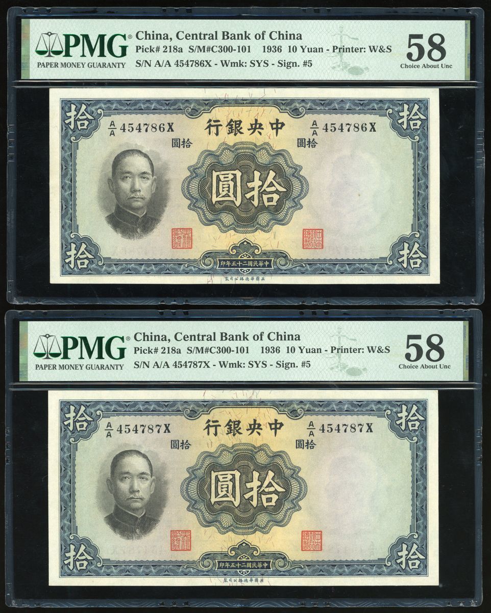 Central Bank of China, a consecutive pair of 10 yuan, Year 25(1936), serial numbers A/A 454786X-87X, (Pick 218a), both graded PMG 58 Choice About Uncirculated (2).