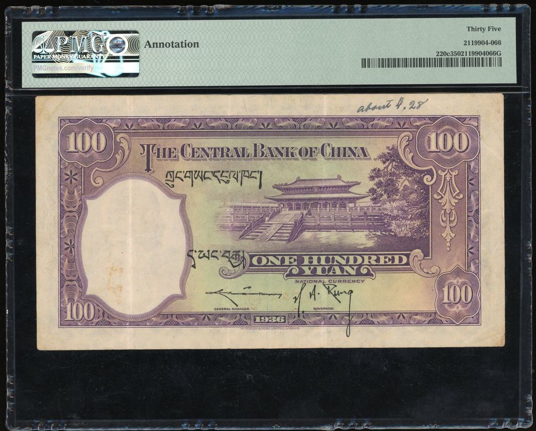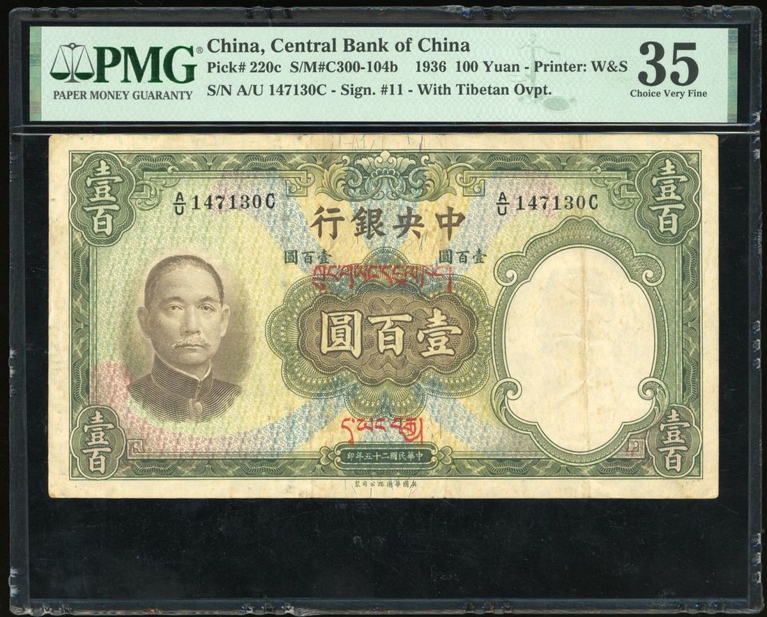 The Central Bank of China, 100 yuan, 1936, serial number A/U 147130C, with Tibetan overprint,