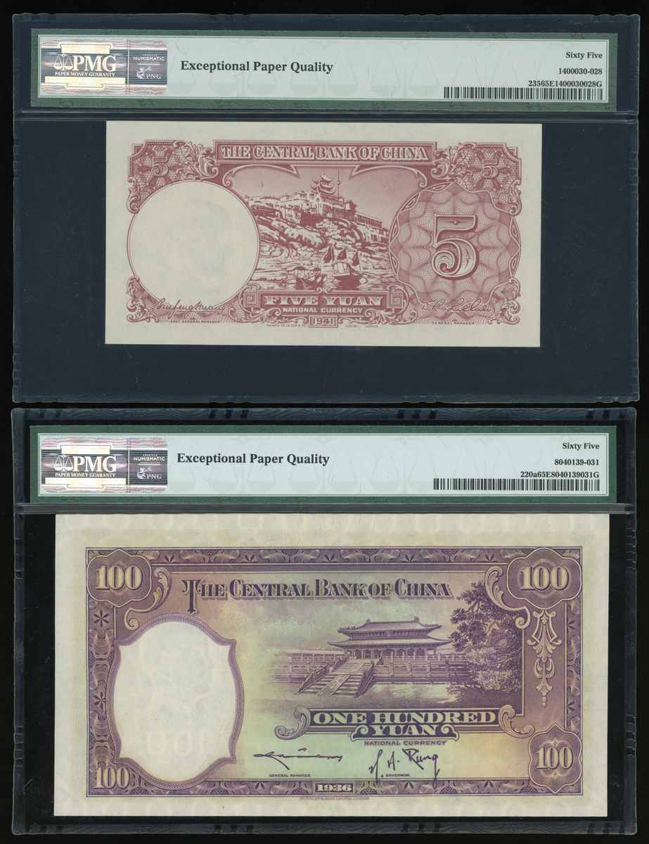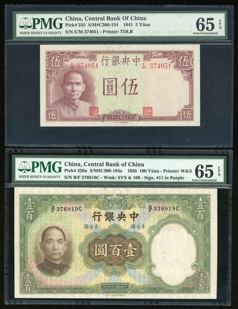 Central Bank of China, 100 yuan and 5 yuan, 1936 and 1941, serial numbers B/F 376819C and E/M 374051,