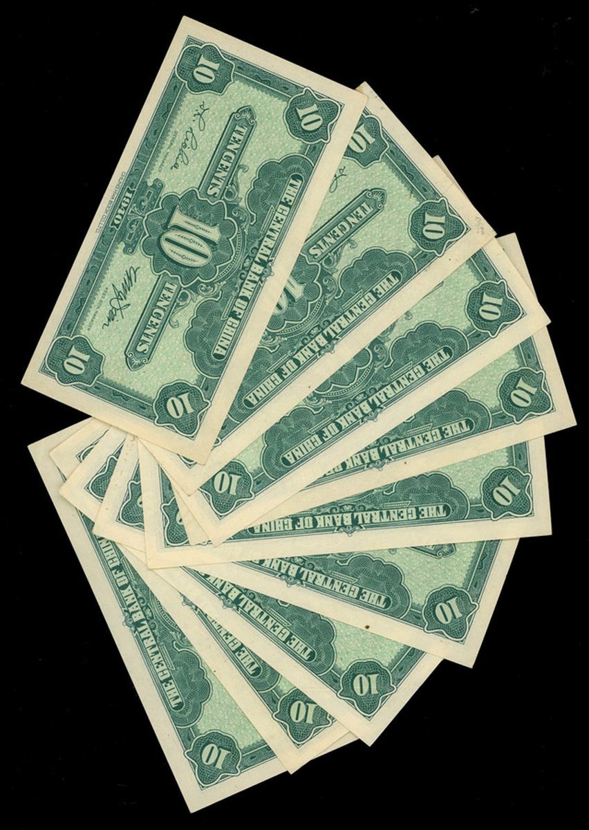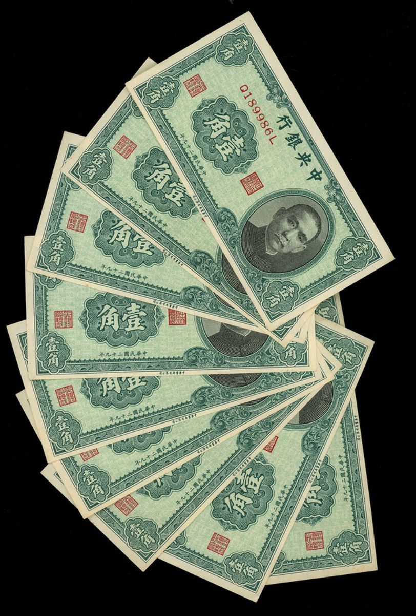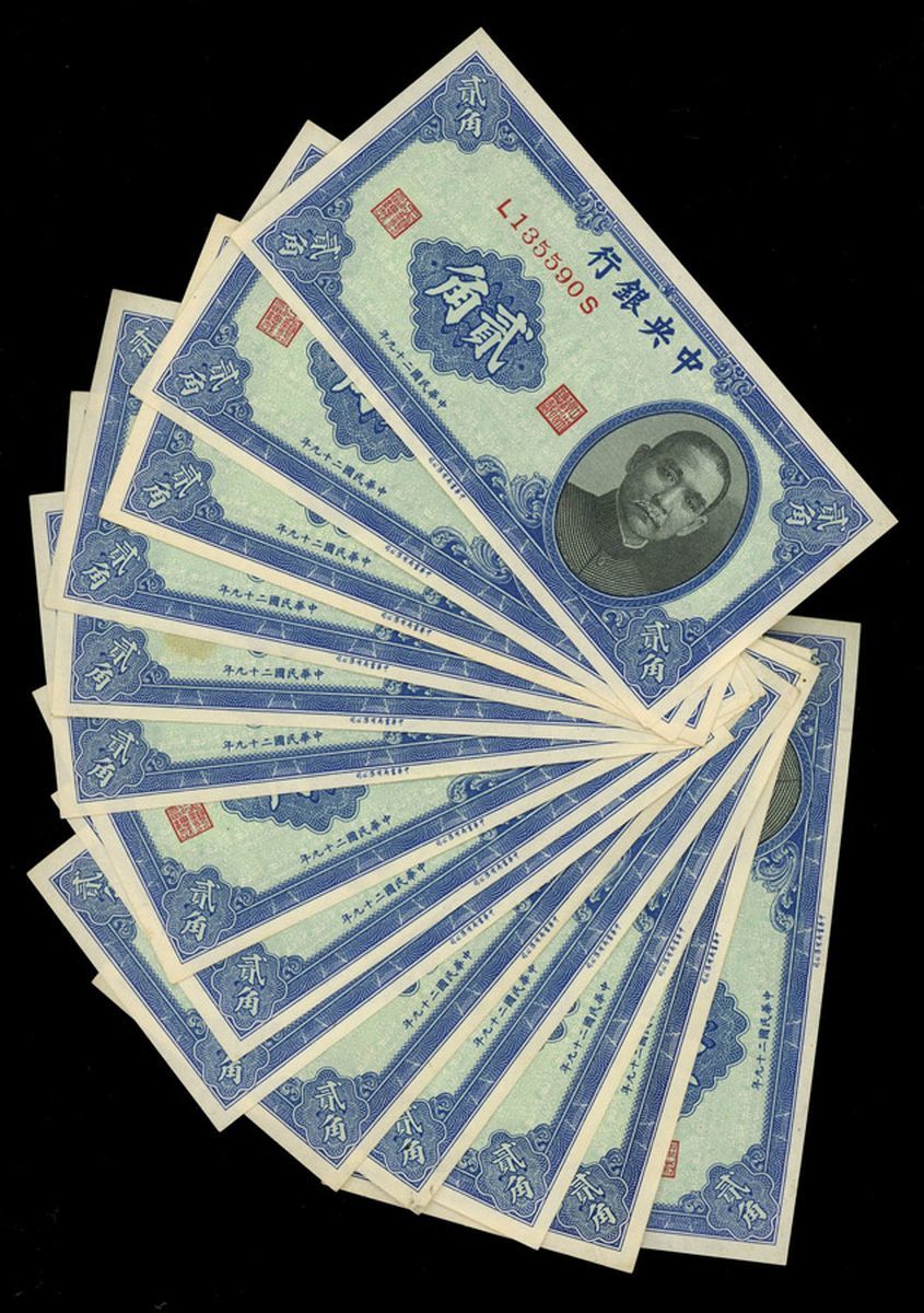 Central Bank of China, group of fractional notes, 1940, 1 jiao (9) and 2 jiao (15),