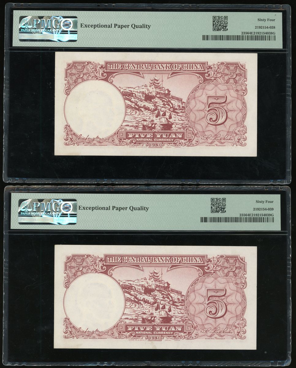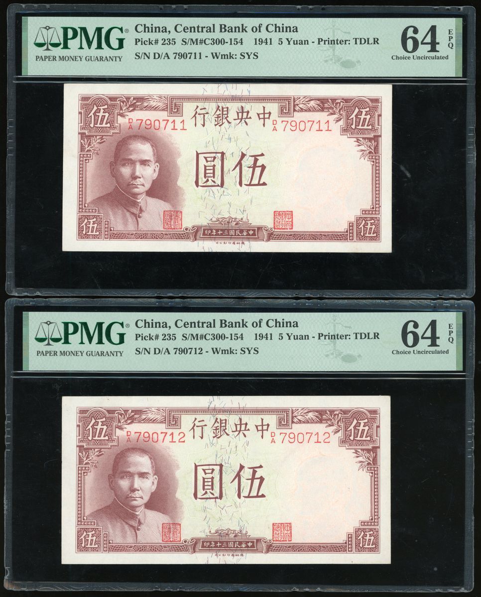 Central Bank of China, a consecutive pair of 5 yuan, 1941, serial number DA 790711-2, brown on pale green underprint, Sun Yat Sen at left,