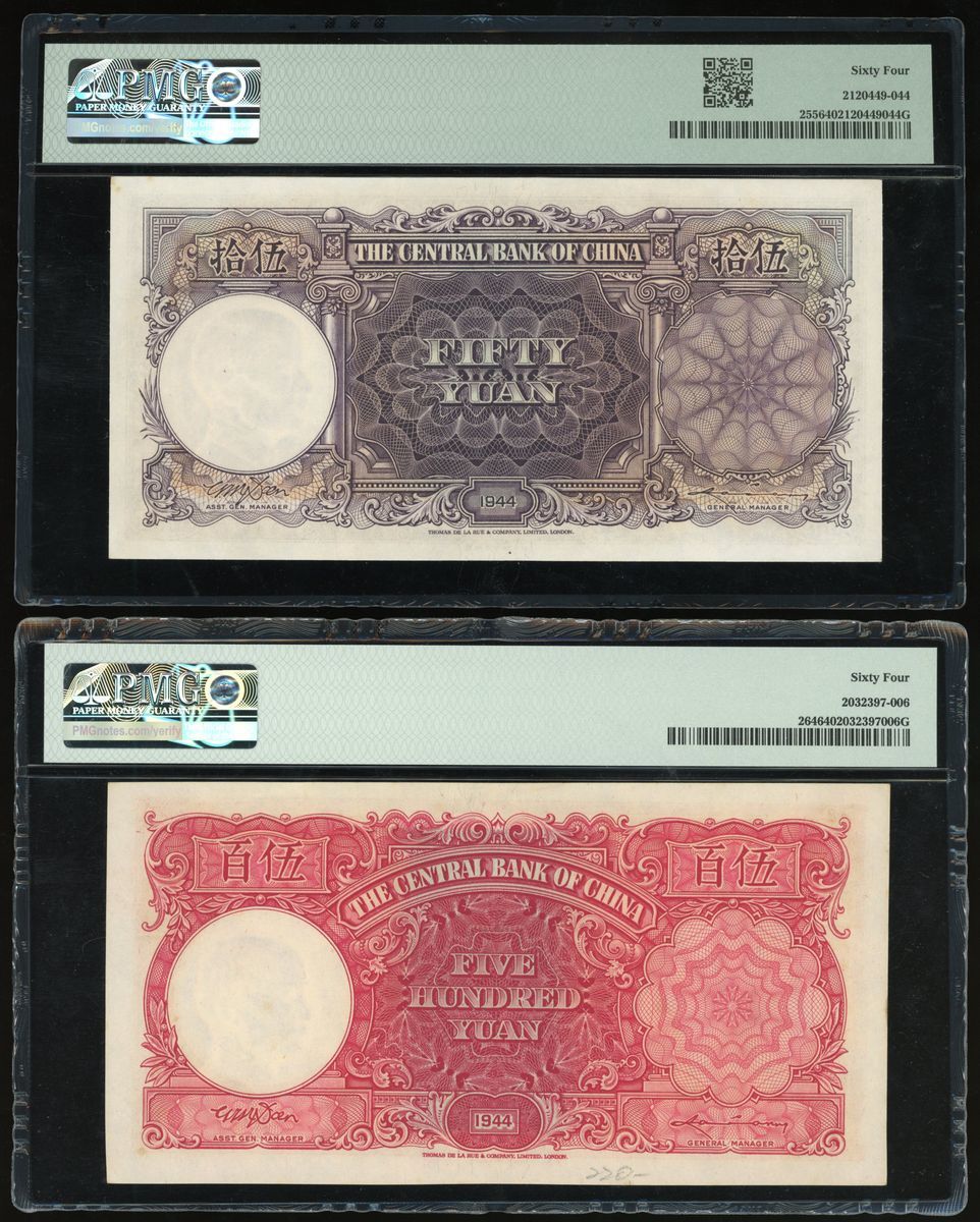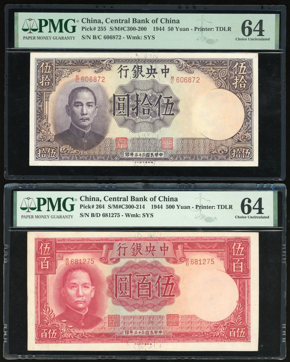 Central Bank of China, a pair of 50 and 500 yuan, Year 33(1944), serial numbers B/C 606872 and B/D 681275, (Pick 255 and 264), both graded PMG 64 Choice Uncirculated (2).