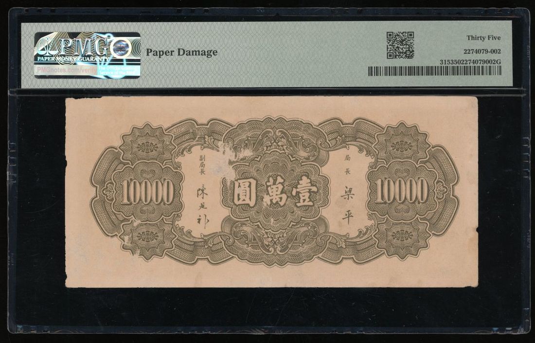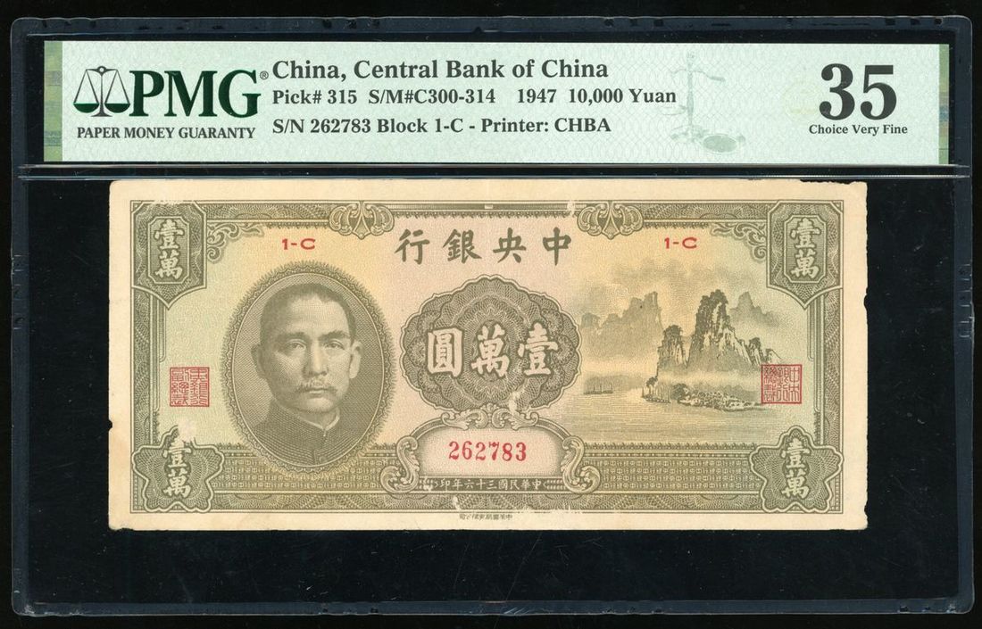 The Central Bank of China, 10000 yuan, Year 36 (1947), serial number 262783, (Pick 315), PMG 35 Choice Very Fine (Paper Damage)