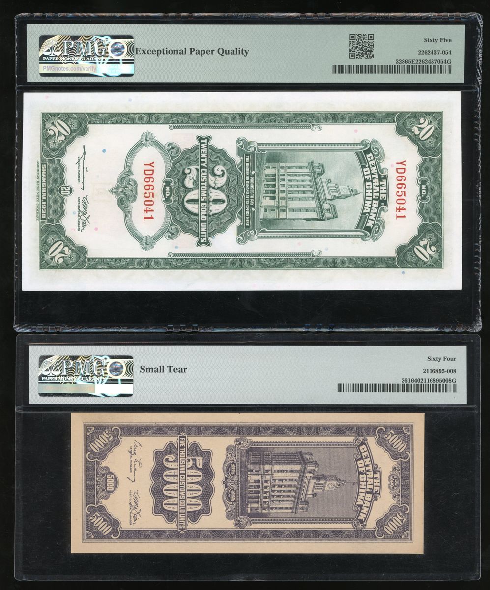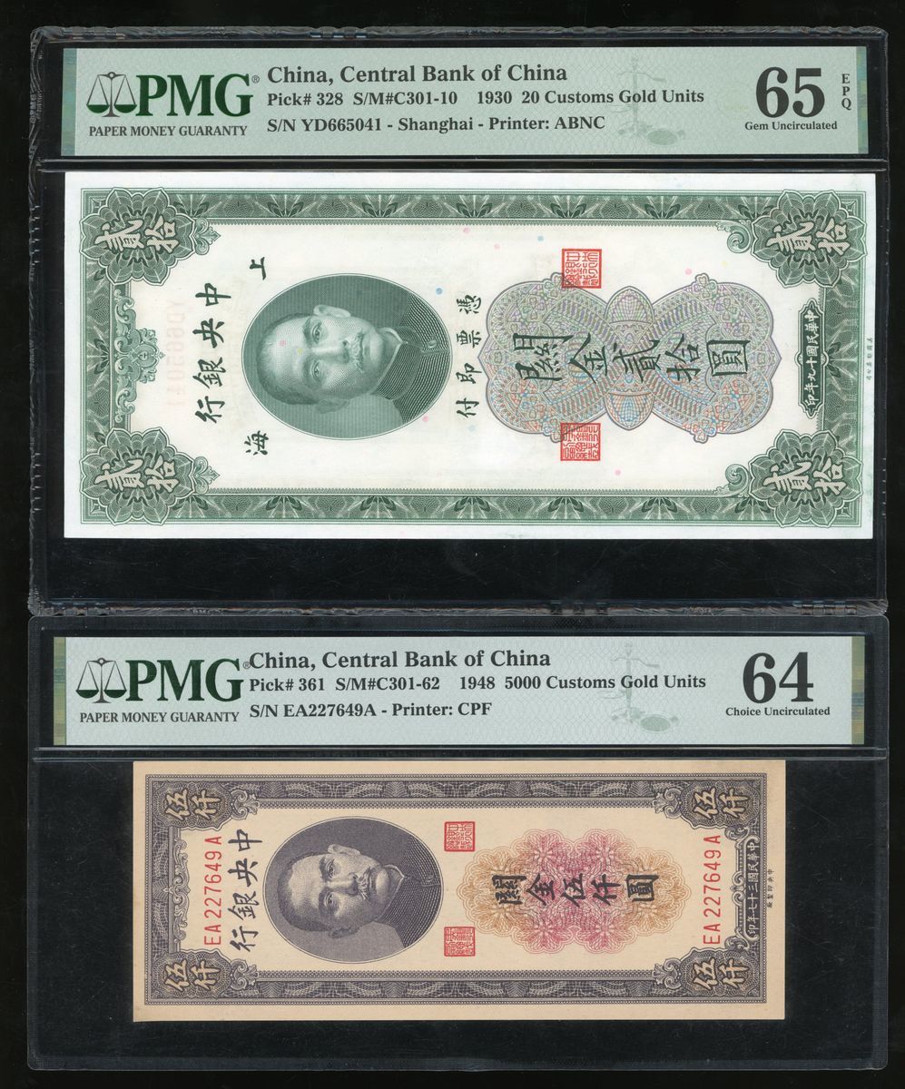 (x) Central Bank of China, a pair, including 20 customs gold units 1930 and 5000 customs gold units 1948, (Pick 328, 361), PMG 65EPQ and 64 respectively (2)