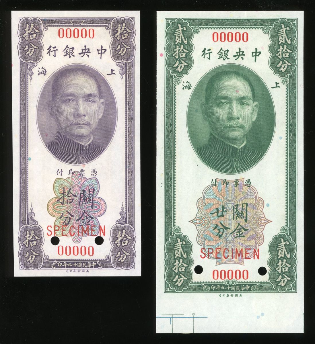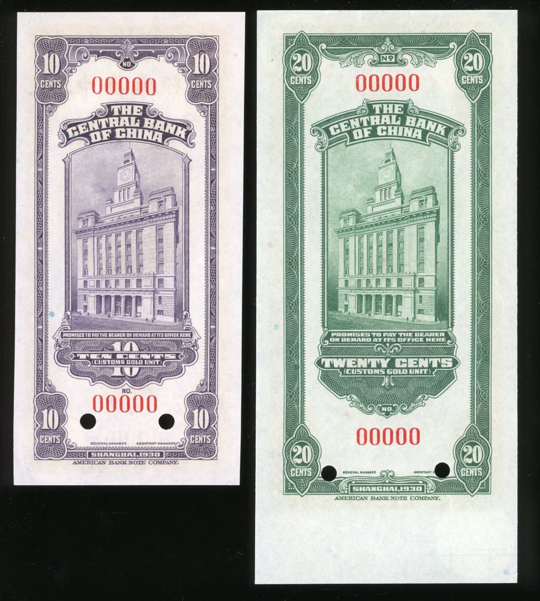 Central Bank of China, a pair of specimen 10 cents and 20 cents CGU, Shanghai, Year 19 (1930), serial number 00000, printed by ABNC,