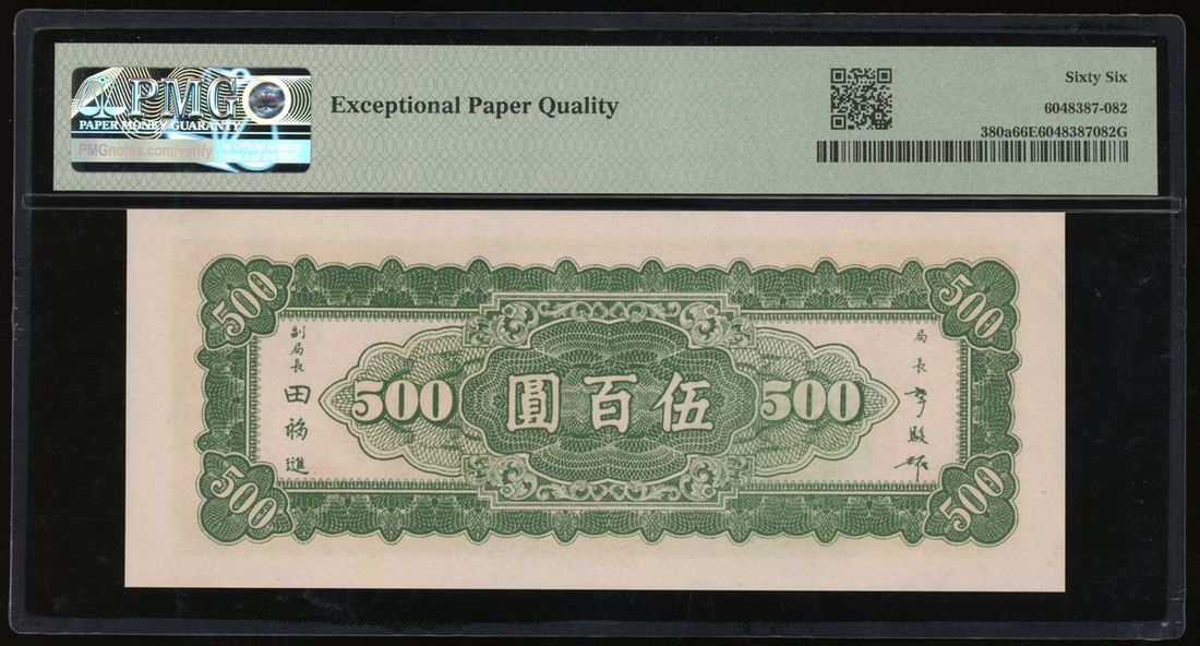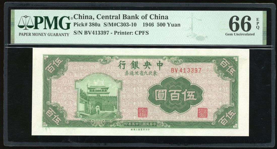 Central Bank of China, 500 yuan, Year 35 (1946), serial number BV 413397, (Pick 380a), PMG 66EPQ