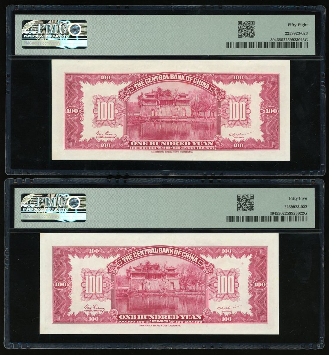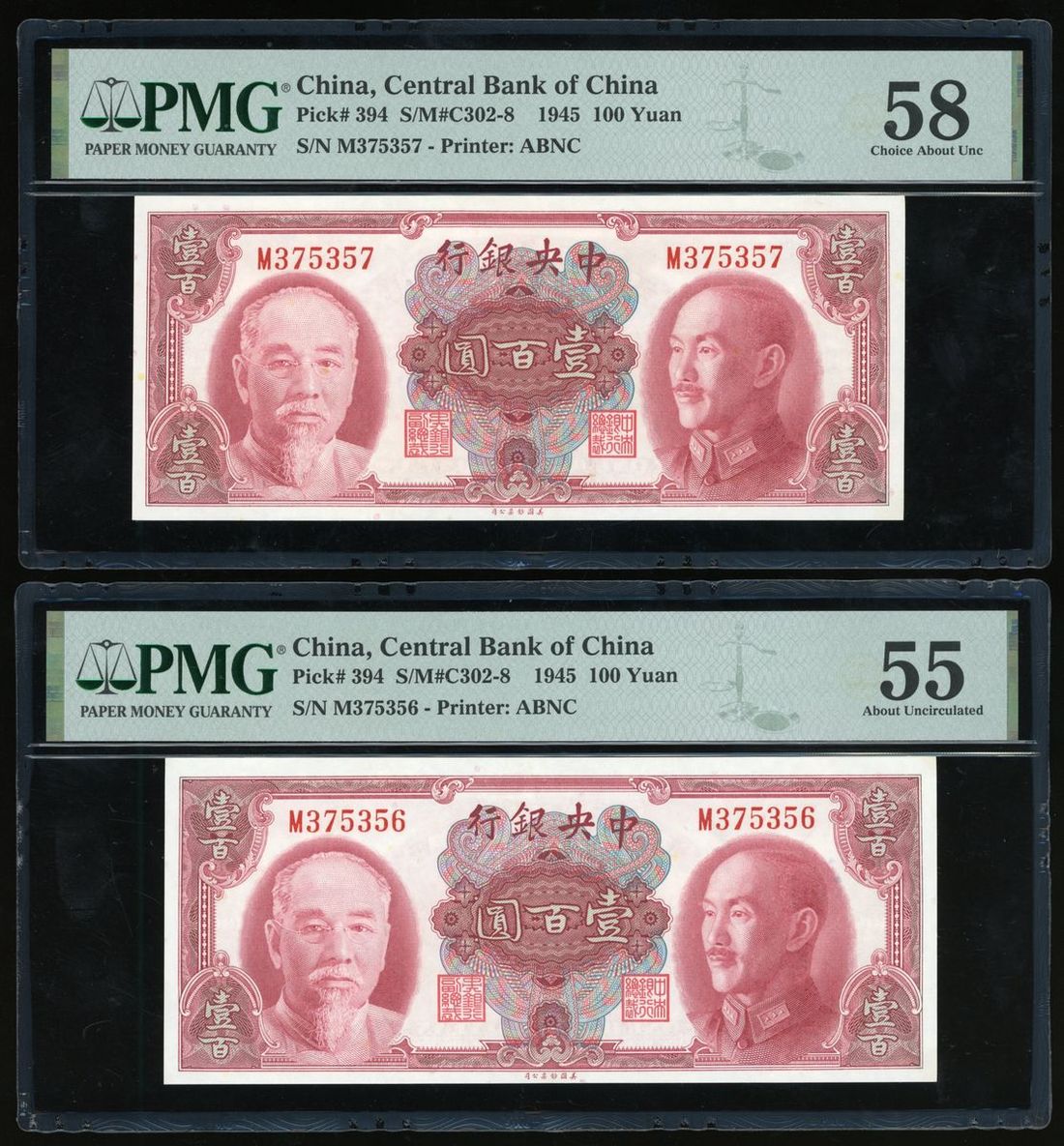Central Bank of China, a consecutive pair of 100 yuan, 1945, serial numbers M375356-57, (Pick 394), graded PMG 55 and 58 respectively (2).