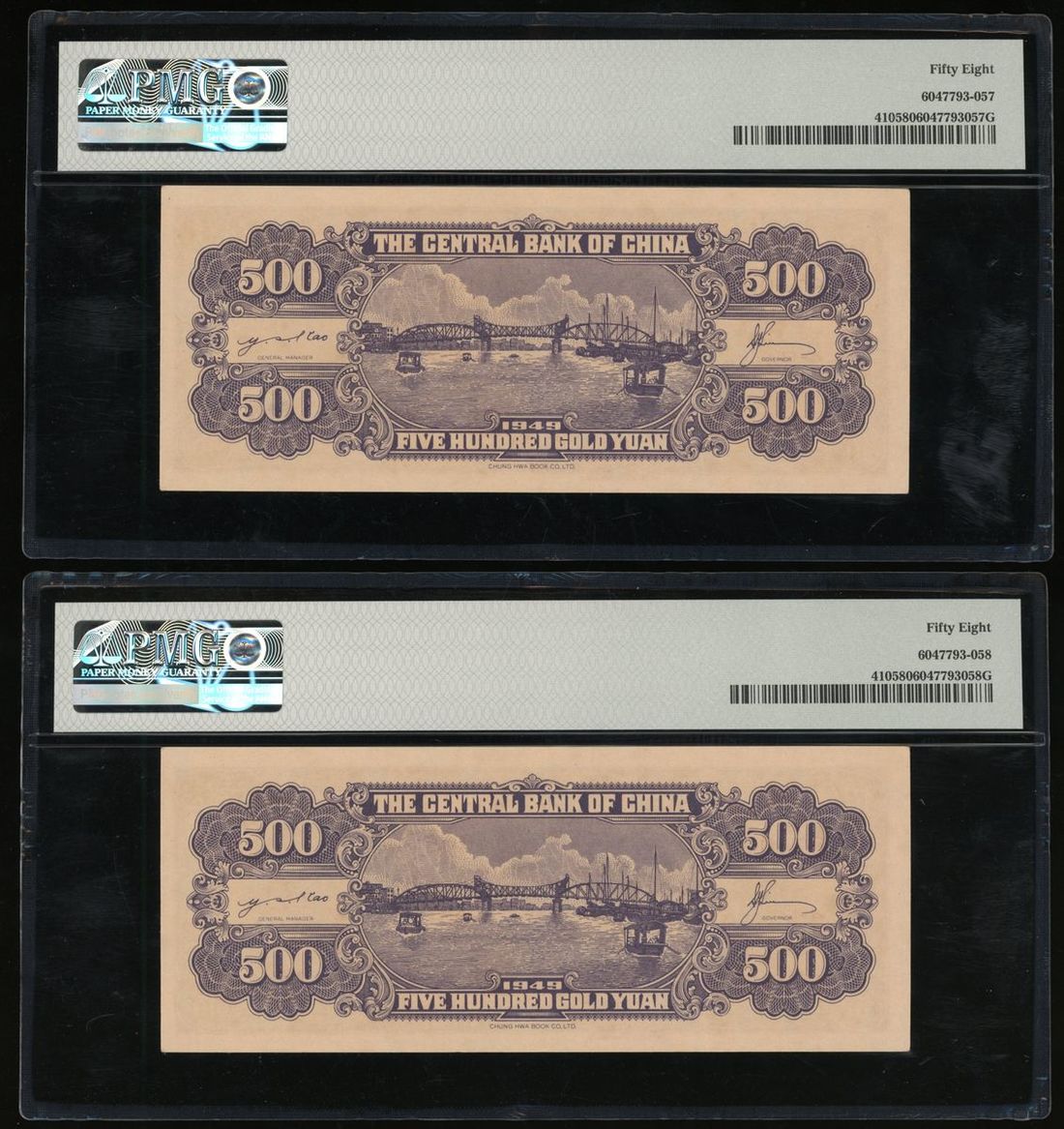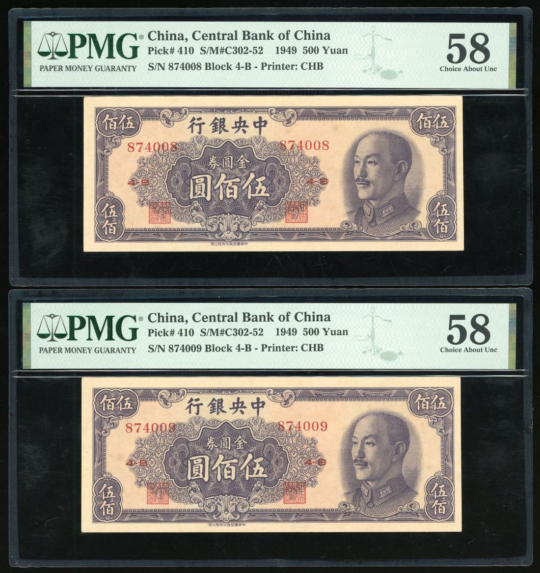 Central Bank of China, a pair of 500 Yuan, 1949, serial number 874008-9, (Pick 410), PMG 58 Choice About Uncirculated (2)