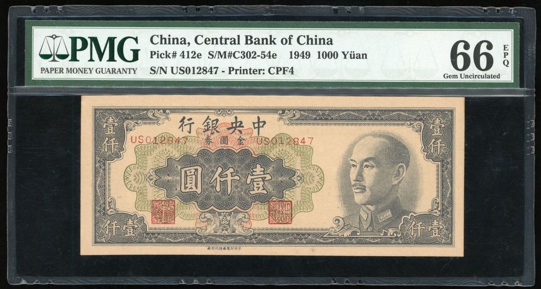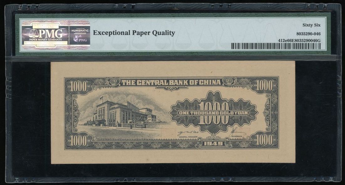 Central Bank of China, 1000 Gold Yuan, 1949, serial number US012847, printed by CPF4,