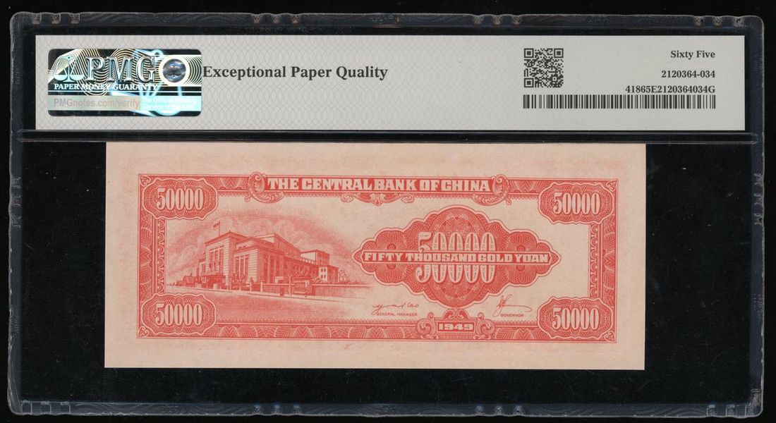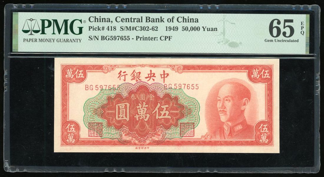 Central Bank of China, 50000 Yuan, 1949, serial number BG597655, (Pick 418), PMG 65EPQ, Gem Uncirculated