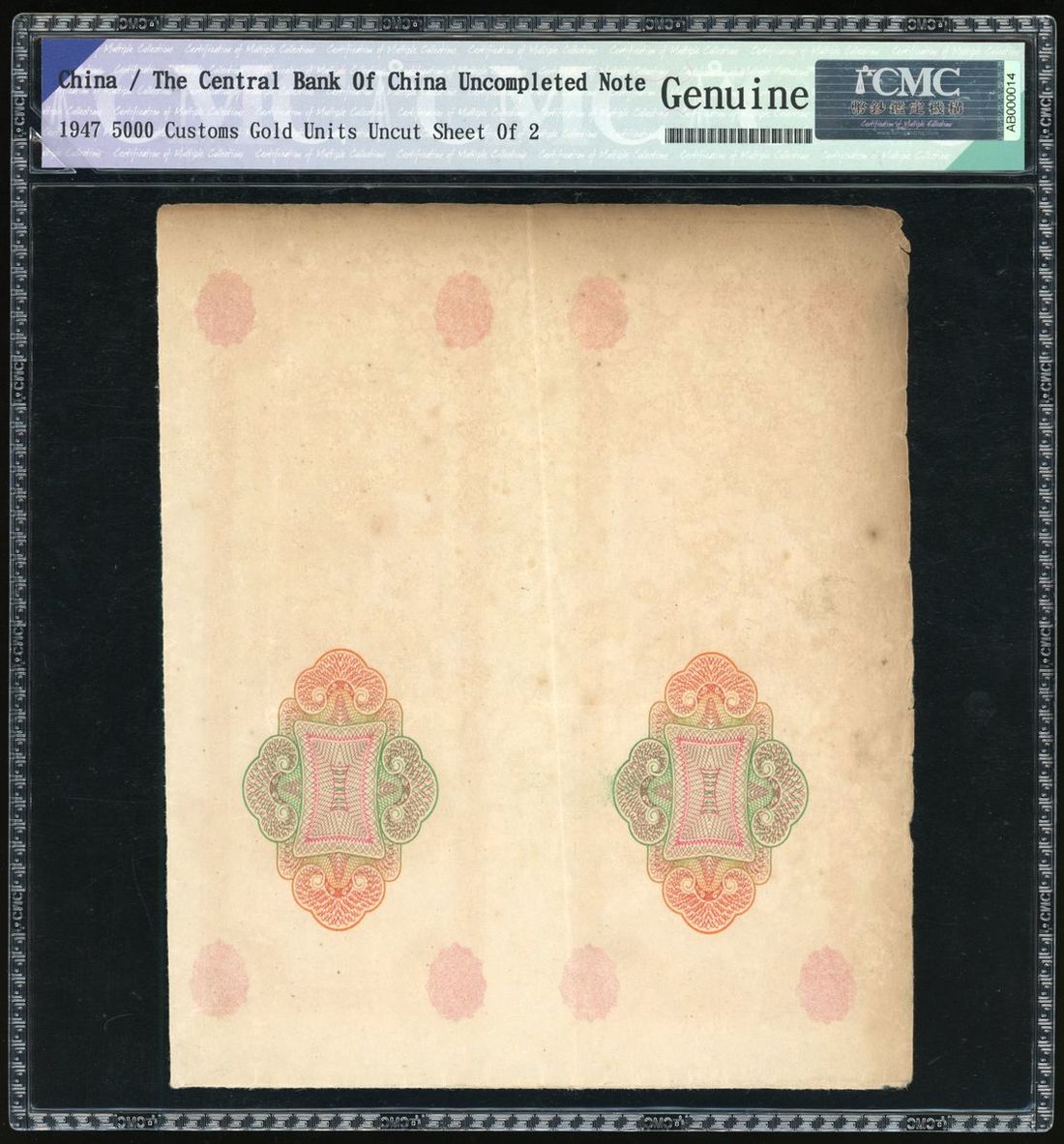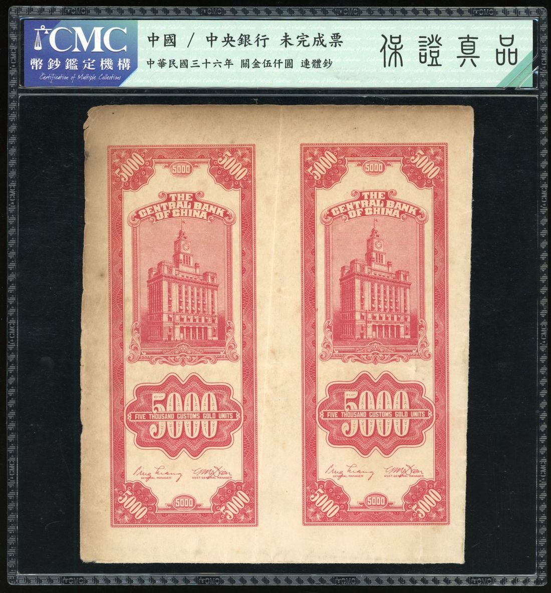 Central Bank of China, an uncut sheet of 2x 5000 customs Gold Units, Year 36(1947), uncompleted note with partial printing on obverse, (Pick 351), CMC Genuine (uncut sheet of 2).