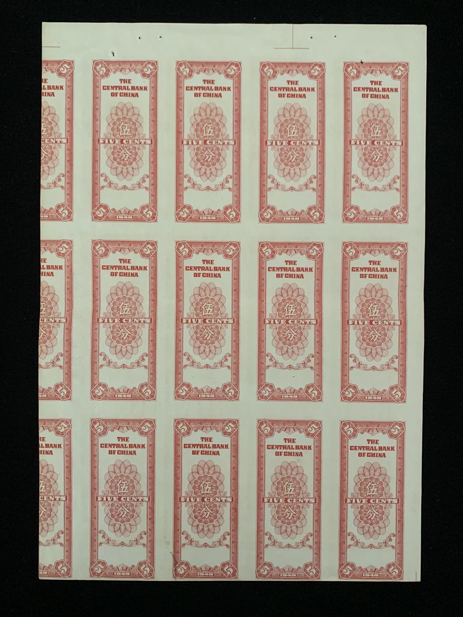 Central Bank of China, an uncut sheet of reverse proof 5 cents, 1949, 12 complete reverse design, 3 incomplete designs,