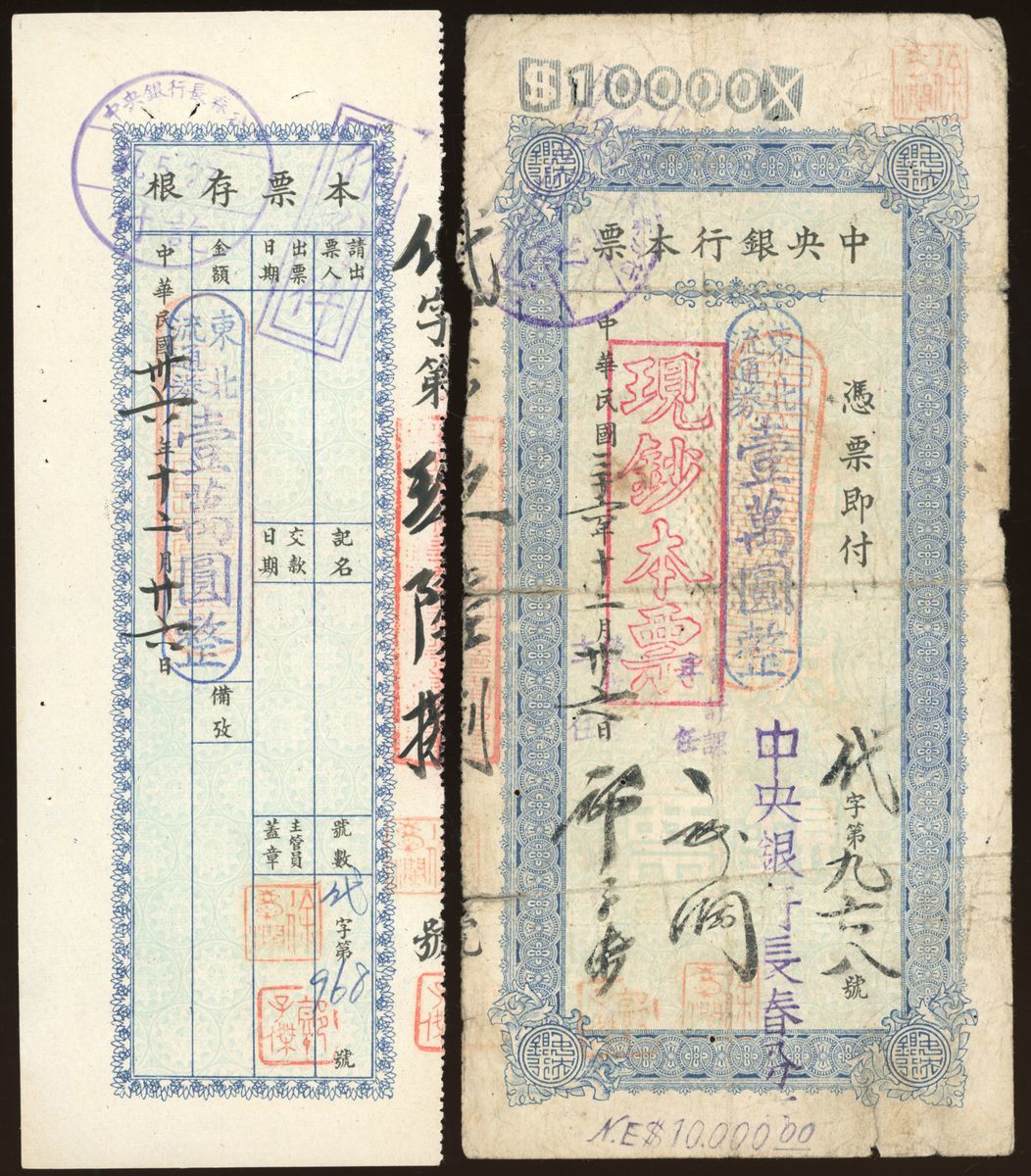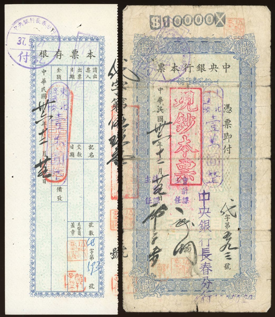 Central Bank of China, Changchun, two cheques for 10,000 yuan, 1950s, also with payment receipt, fine (4)