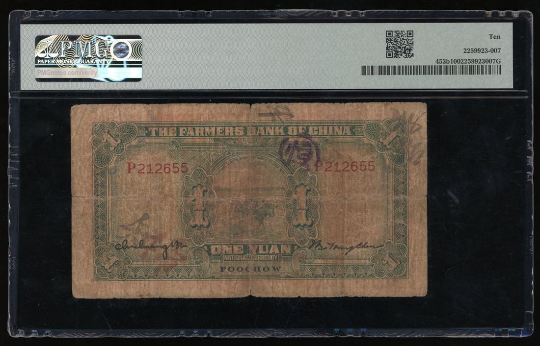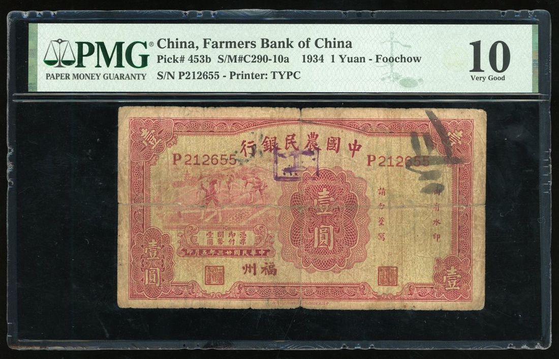 Farmers Bank of China, 1 yuan, Foochow, Year 23(1934), serial number P212655, (Pick 453b), PMG 10 Very Good, rare branch.