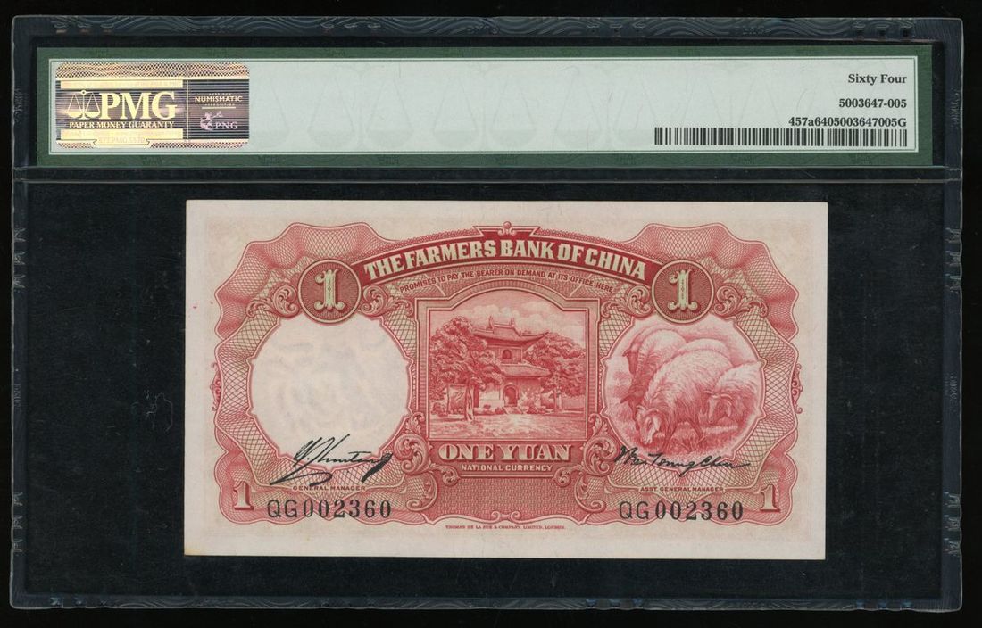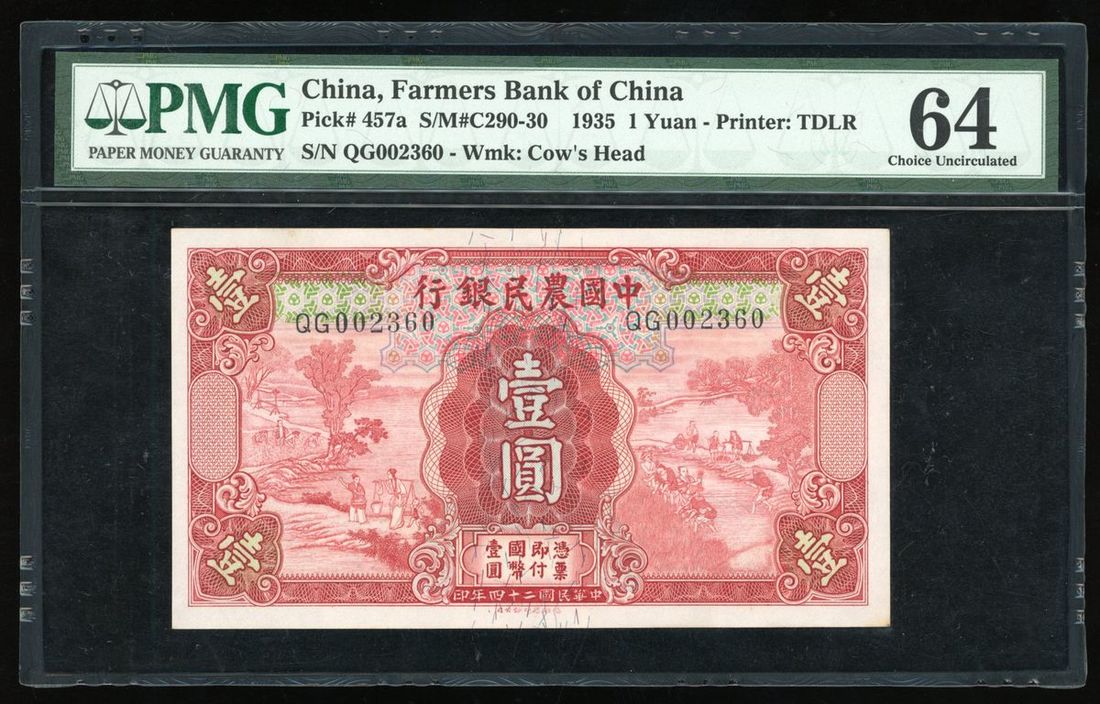Farmers Bank of China, 1 yuan, 1935, serial number QG002360, (Pick 457a), PMG 64.