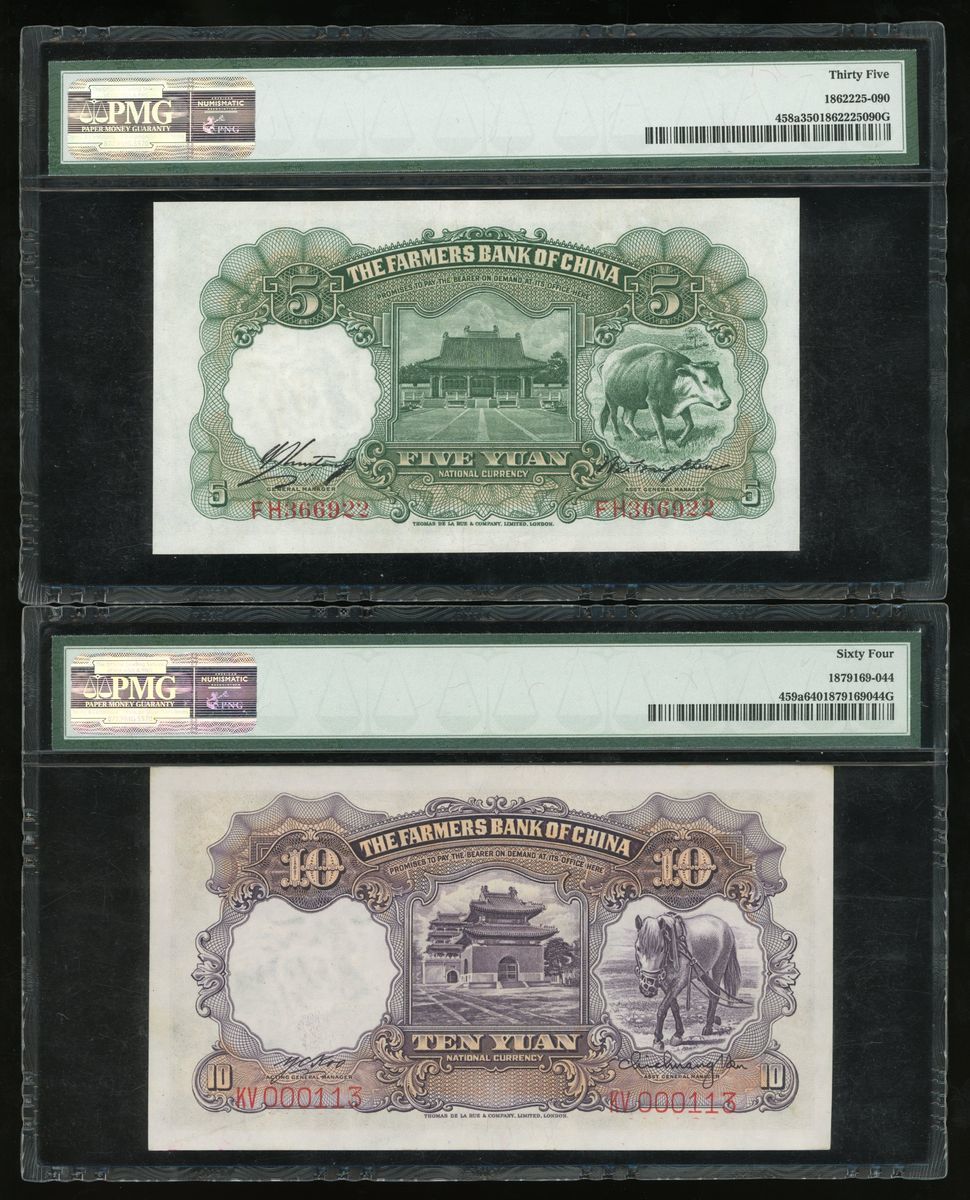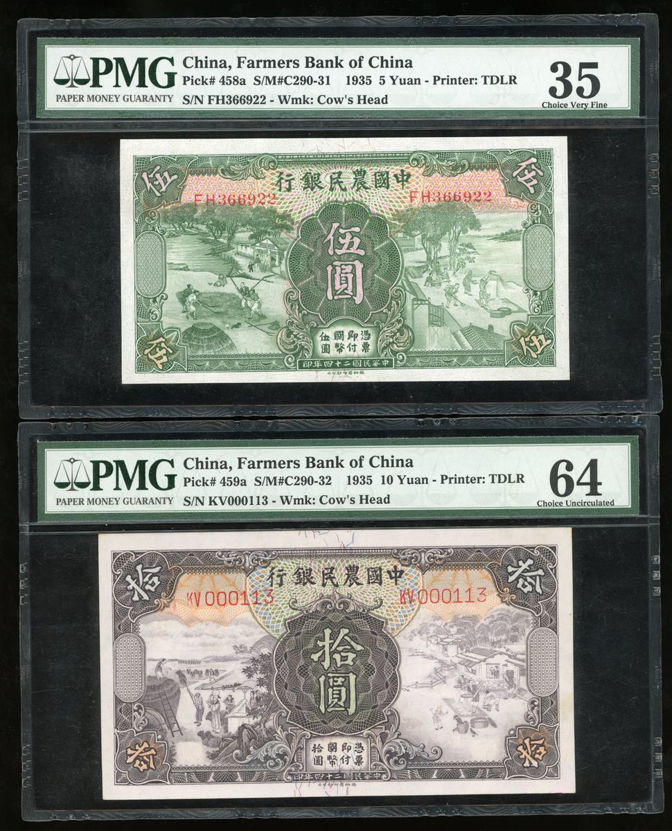 (x) Farmers Bank of China, a pair, including 5 and 10 yuan, 1935, (Pick 458a, 459a), PMG 35, 64 respectively (2)