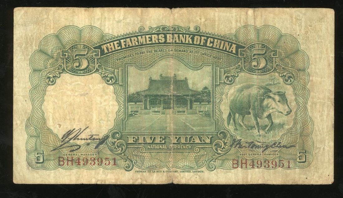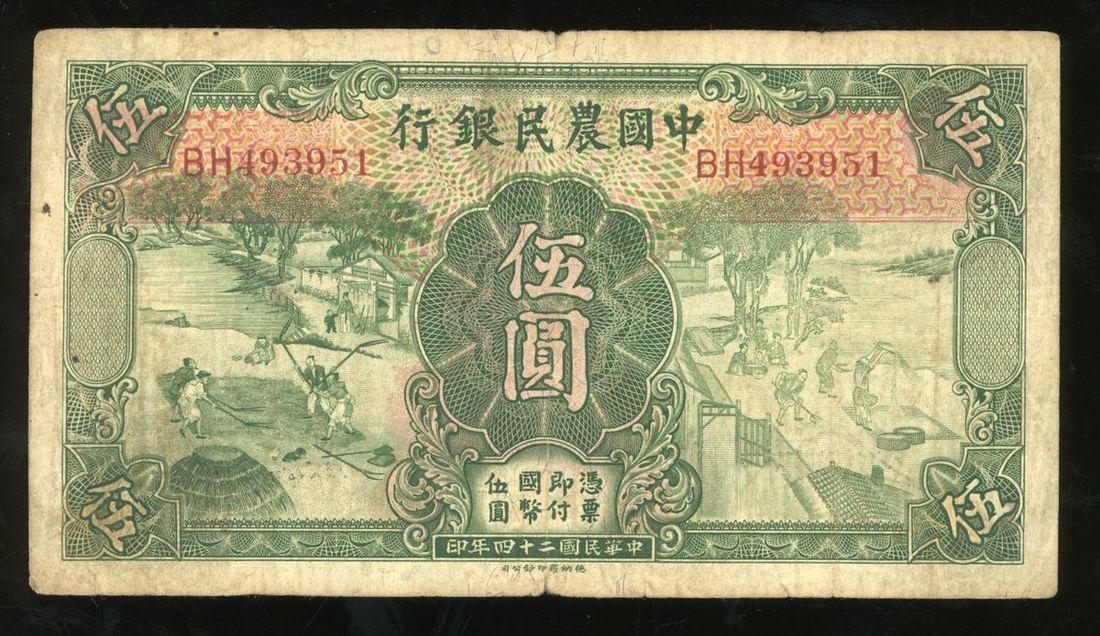 Farmers Bank of China, 5 yuan, Year 24 (1935), serial number BH493951, (Pick 458), Good Very Fine, small tear near centre