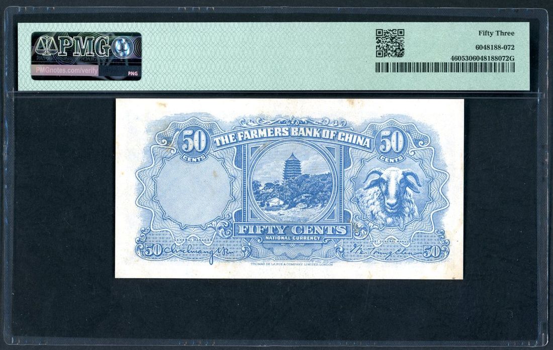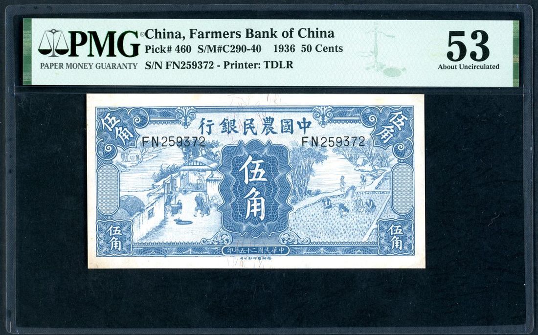 Farmers Bank of China, 50 cents, Year 25(1936), serial number FN259372, (Pick 460), PMG 53 About Uncirculated.