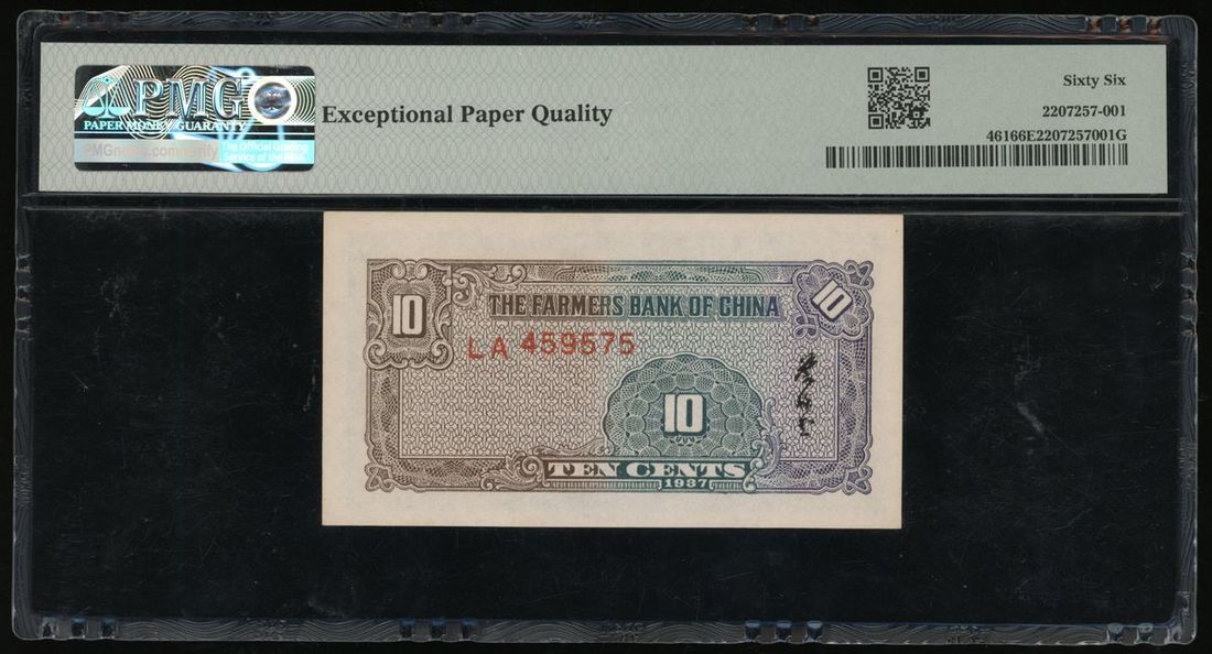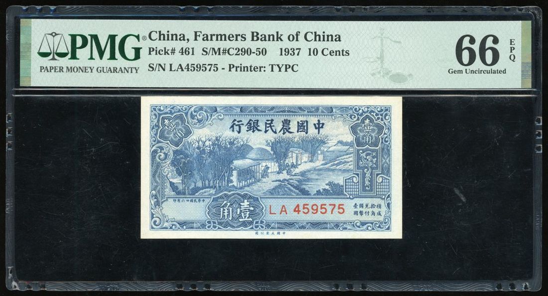 Farmers Bank of China, 10 cents, 1937, serial number LA459575, (pick 461), PMG 66EPQ.