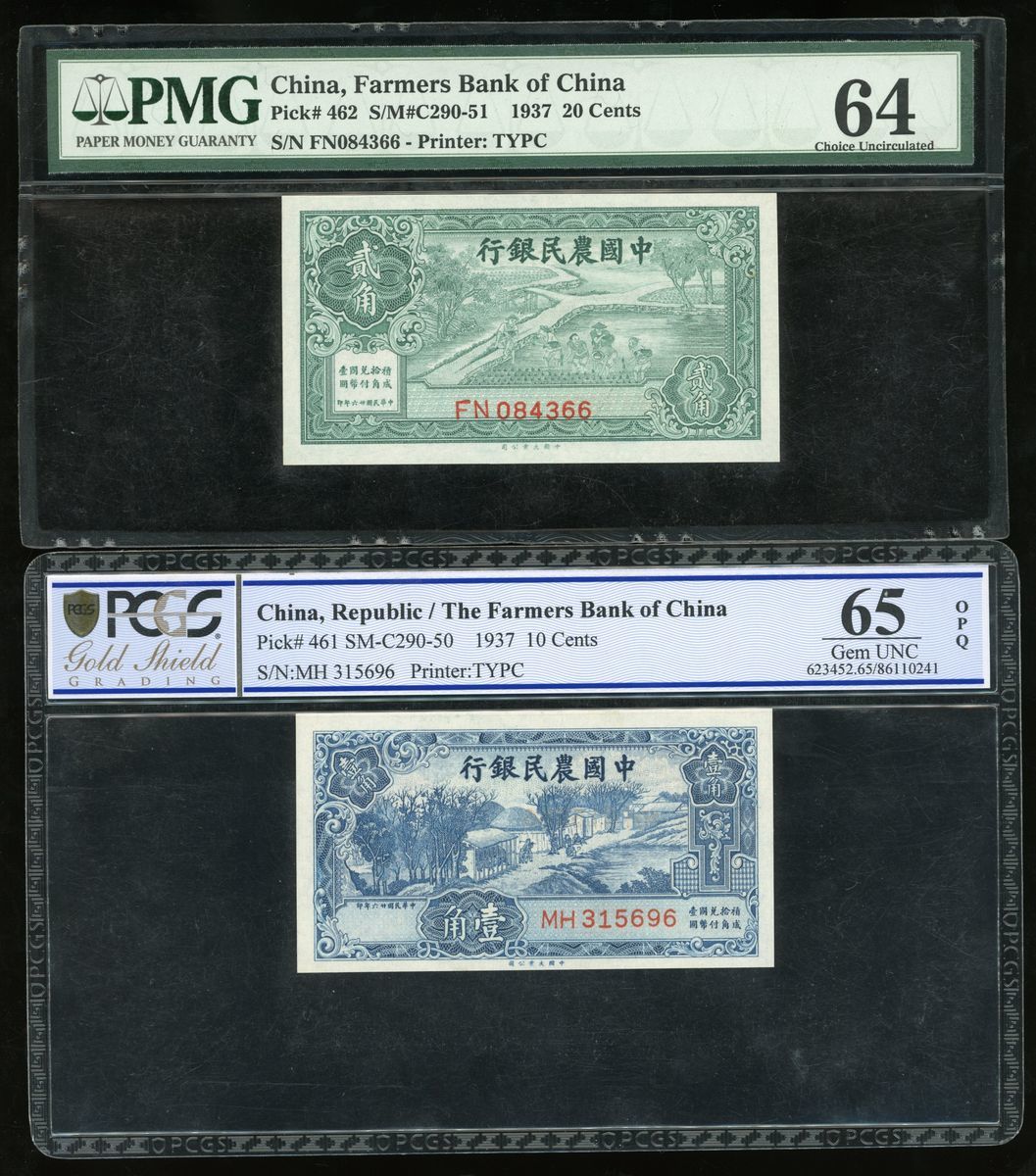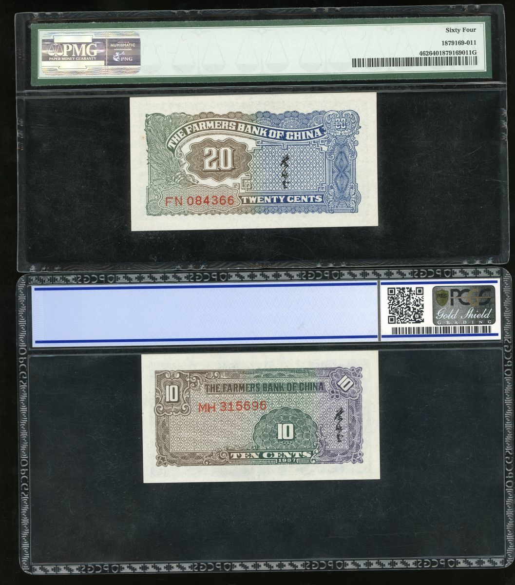 (x) Farmers Bank of China, a pair, including 10 and 20 cents, 1937, (Pick 461, 462), PCGS 65OPQ and PMG 64 respectively (2)