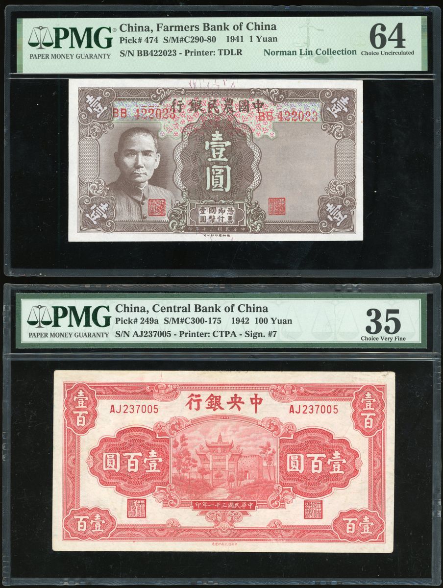 Farmers Bank of China, 1 yuan, Year 30(1941), and Central Bank of China, 100 yuan, Year 31(1942), serial numbers BB422023 and AJ237005, (Pick 474 and 249a), graded PMG 64 and 35 respectively, Norman Lin Collection.
