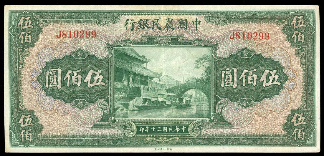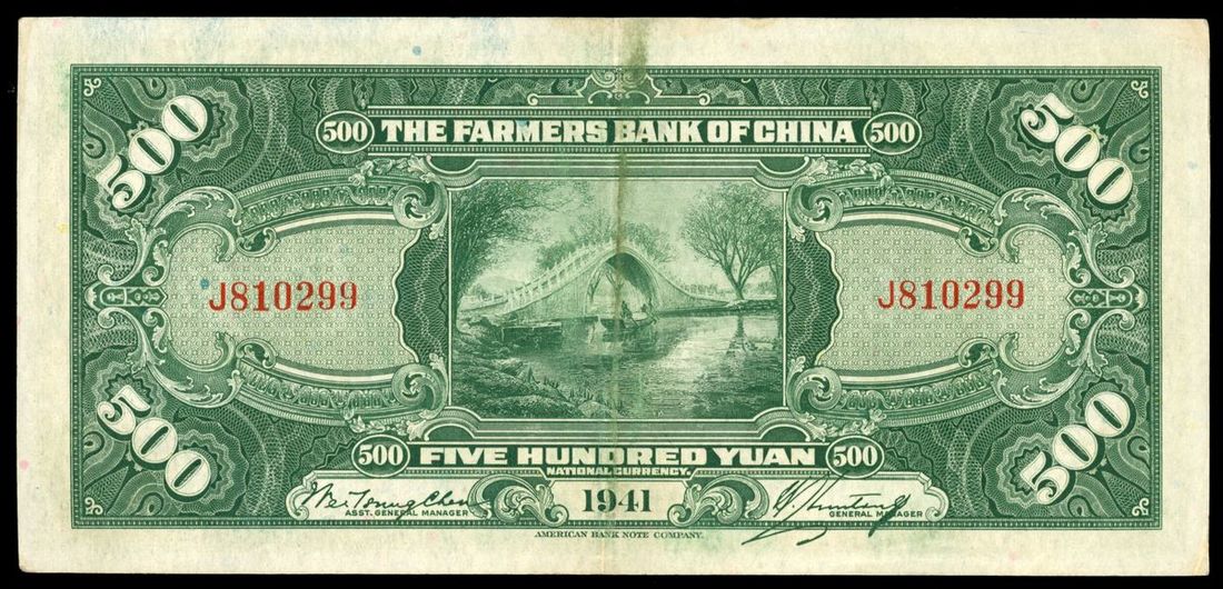 Farmers Bank of China, 500 yuan, 1941, serial number J810299, Huili temple and Ziwei bridge at centre on obverse, Xiashi river on reverse,
