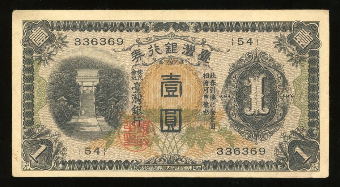 Bank of Taiwan, 1 yuan, ND (1932-45), block 54, serial number 336369, (Pick 1925a), pressed, very fine