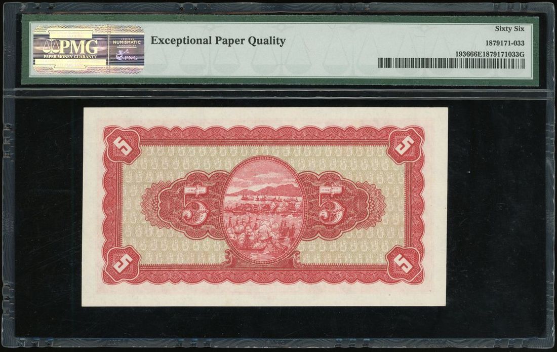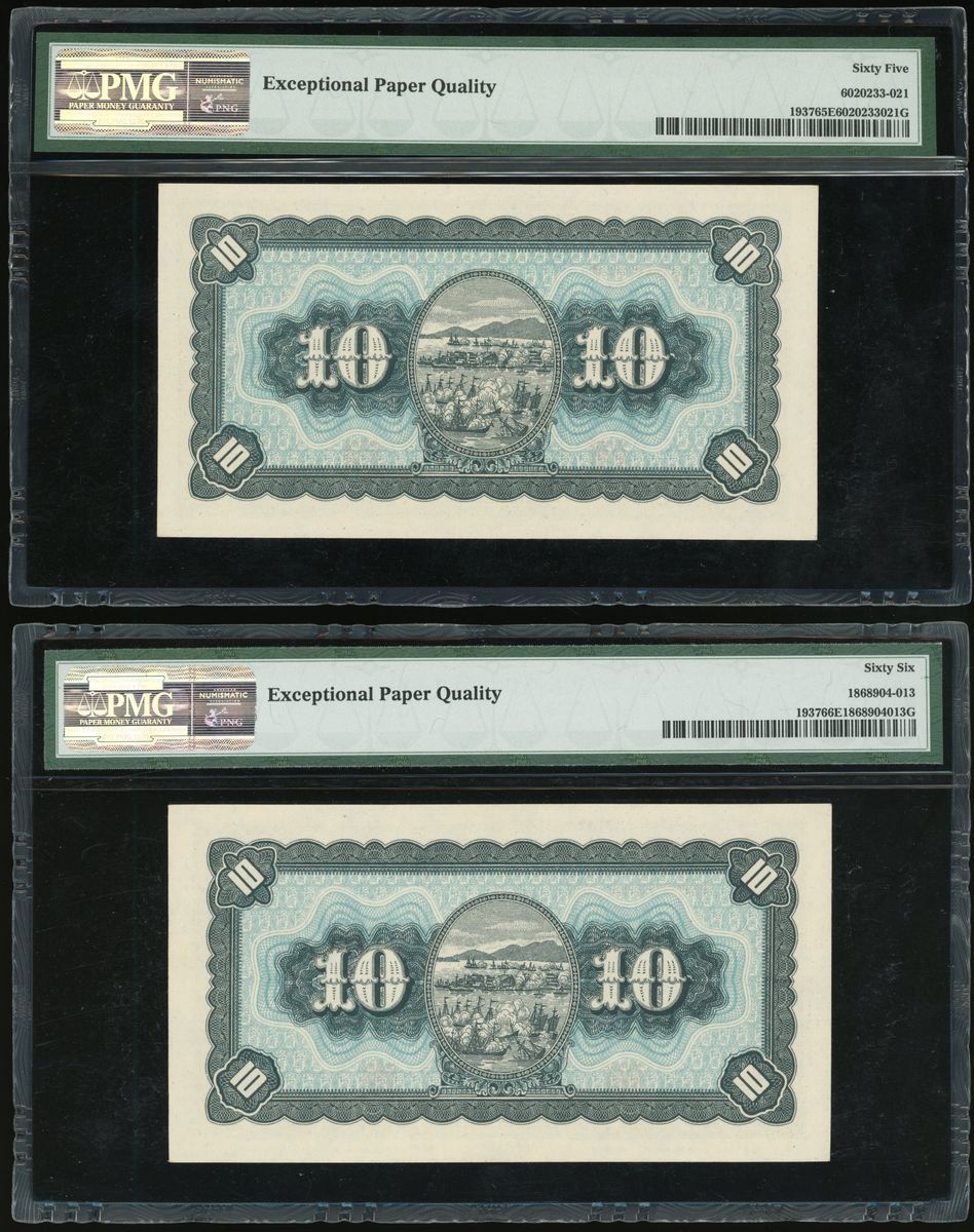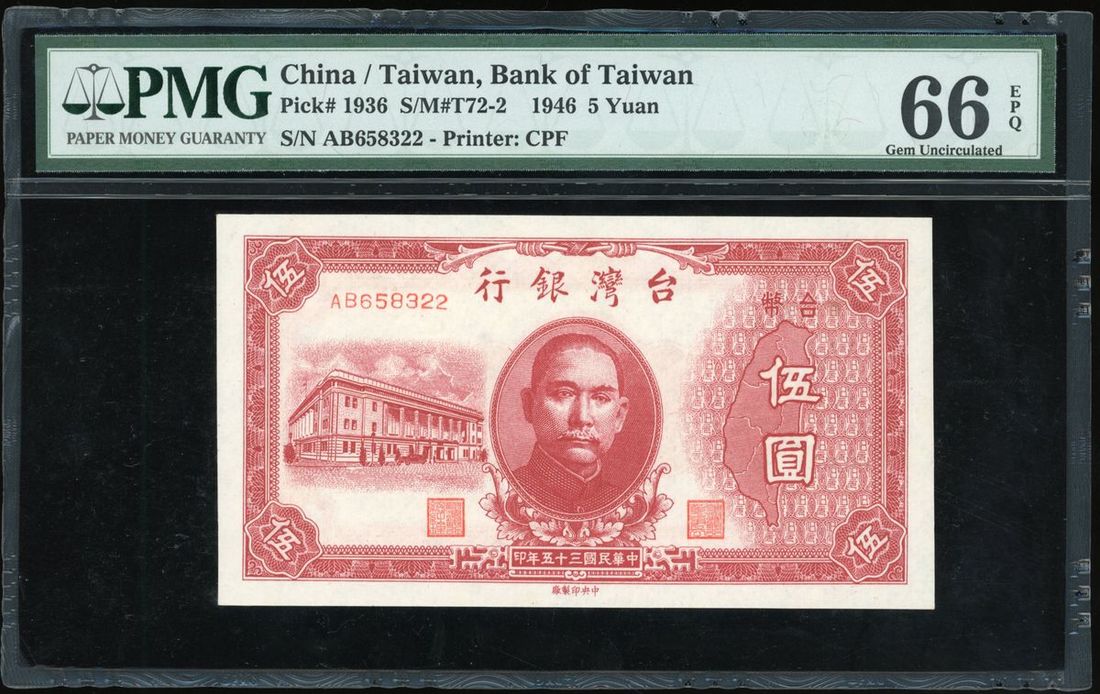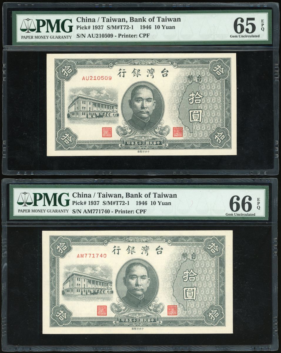 Bank of Taiwan, a group of 3x, consists of 1x 5 yuan and 2x 10 yuan, Year 35(1946), serial numbers AB658322, AU210509 and AM771740, (Pick 1936 and 1937), graded PMG 66EPQ, 65EPQ and 66EPQ respectively (3).