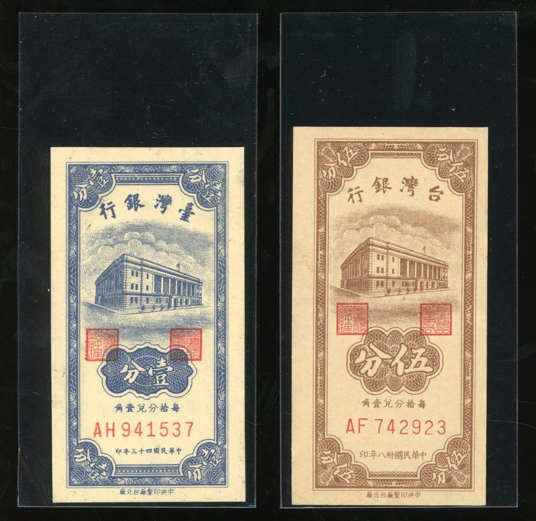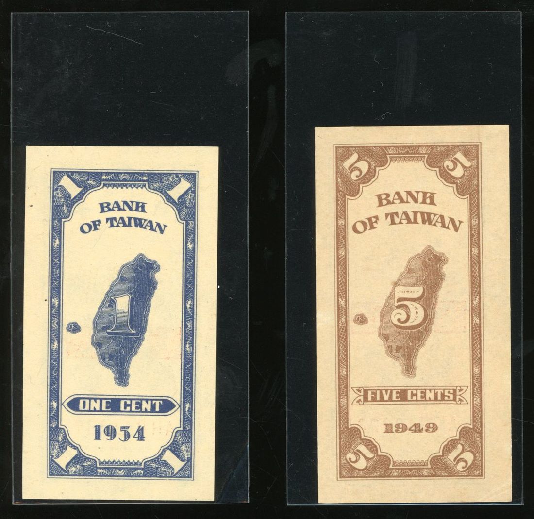 Bank of Taiwan, 1 cent and 5 cents, 1954 and 1949, serial numbers AH941537 and AF742923, (Pick 1963, 1947), Uncirculated (2)