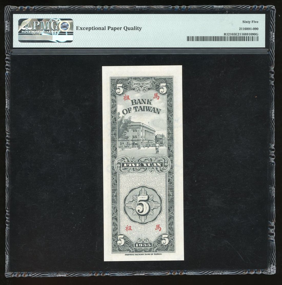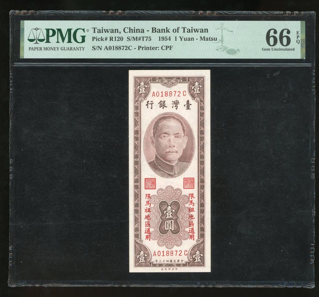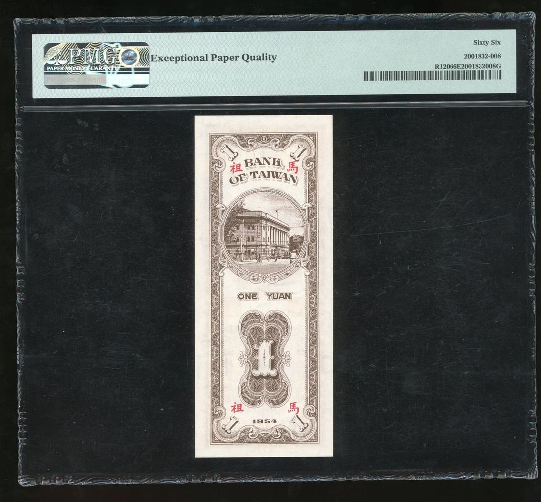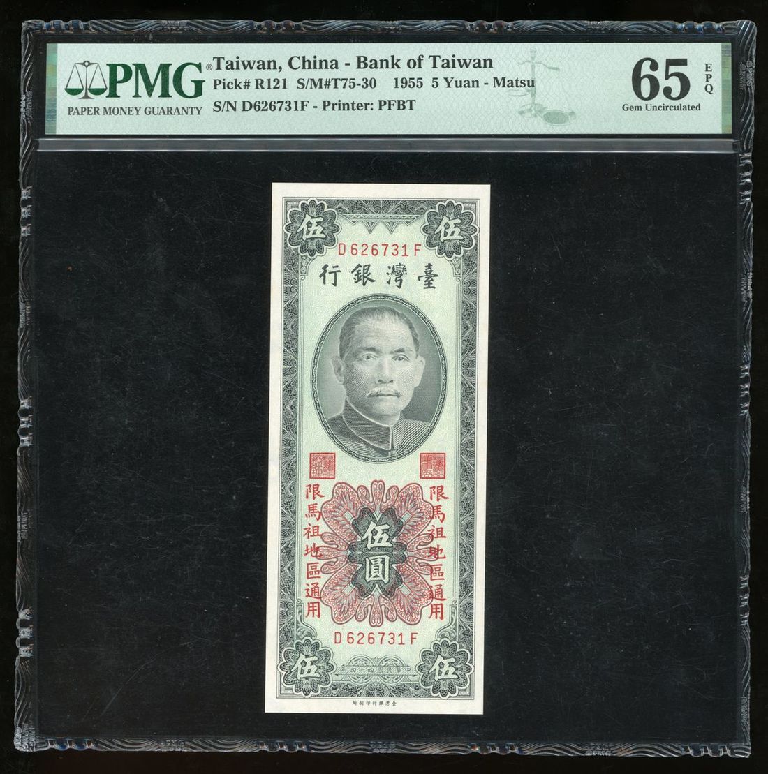 (x) Bank of Taiwan, a pair of Matsu issue, including 1 yuan 1954 and 5 yuan 1955, (Pick R120, R121), PMG 66EPQ, 65EPQ respectively (2)