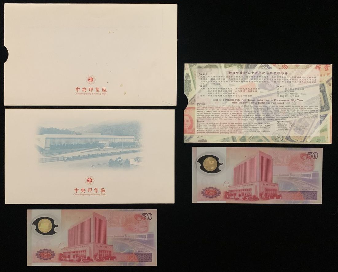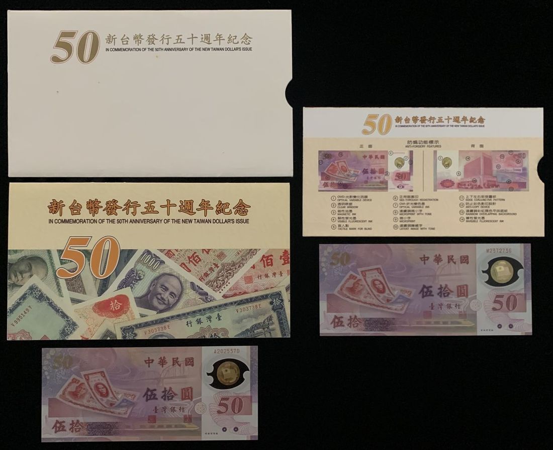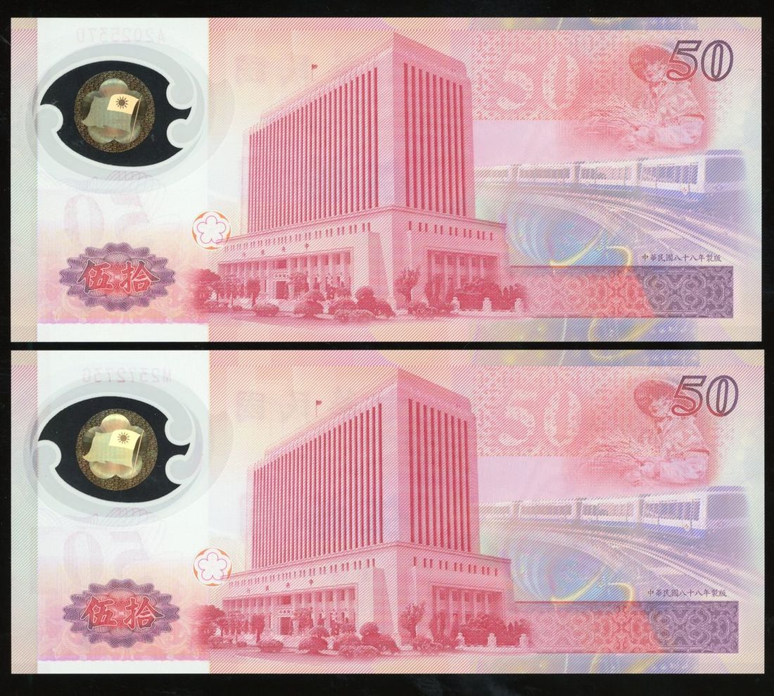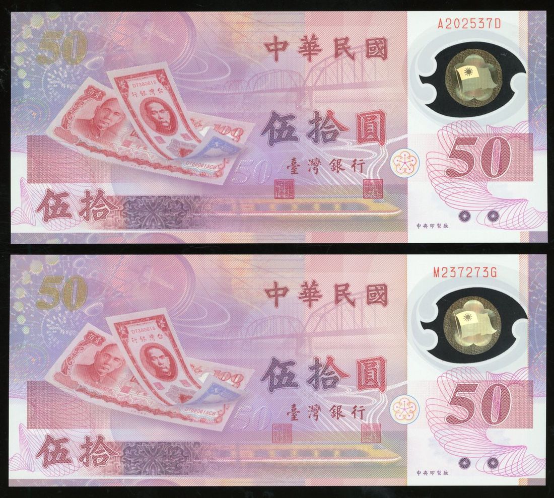Bank of Taiwan, a pair of polymer 50 yuan, 1999 New Yuan Commemorative Issues, serial numbers M237273G, A202537D, (Pick 1990), Uncirculated, in original presentation folders (2)