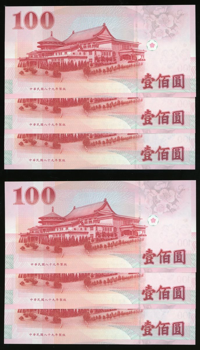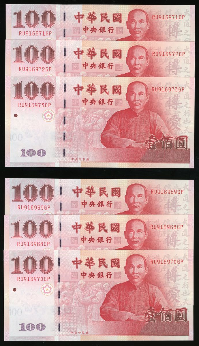 Central Bank, Taiwan, a group of 6x 100 yuan, Year 89(2000), 2 consecutive run of 3, serial numbers RU916971-73GP and RU916968-70GP, (Pick 1991), uncirculated, viewing recommended, sold as seen no return (6).
