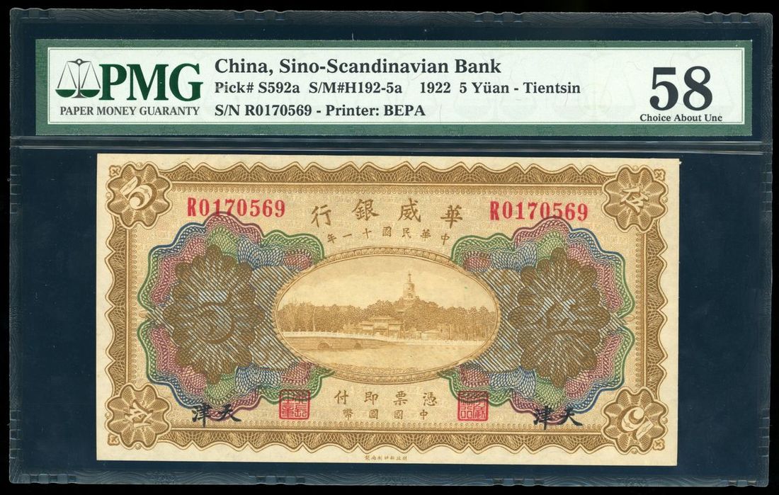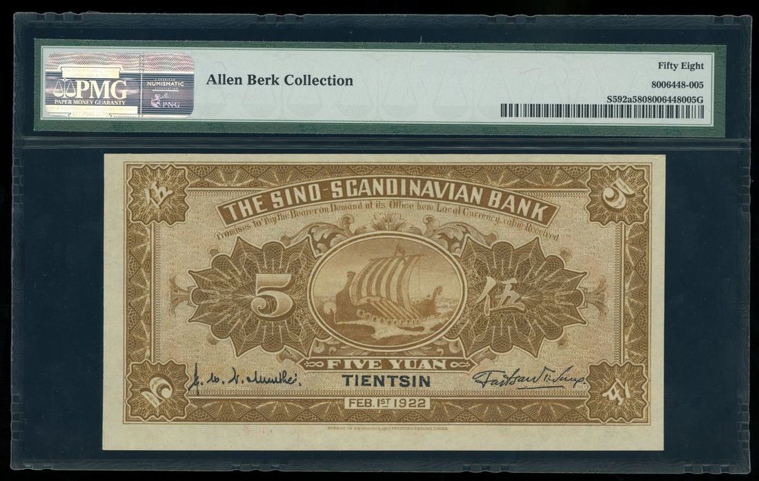 Sino-Scandinavian Bank, China, 5 yuan, Tientsin, Year 11 (1922), serial number R1070569, (Pick S592a), PMG 58 Choice About Uncirculated (Allen Berk Collection).