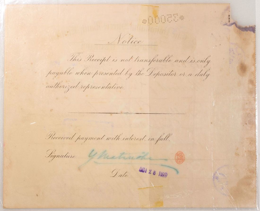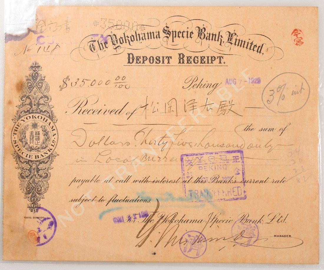 The Yokohama Specie Bank, Ltd., China, Deposit Receipt, $35000, Peking, 1925, serial number 148, extremely fine.