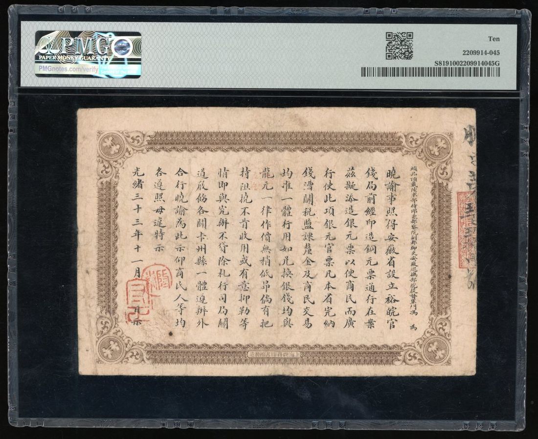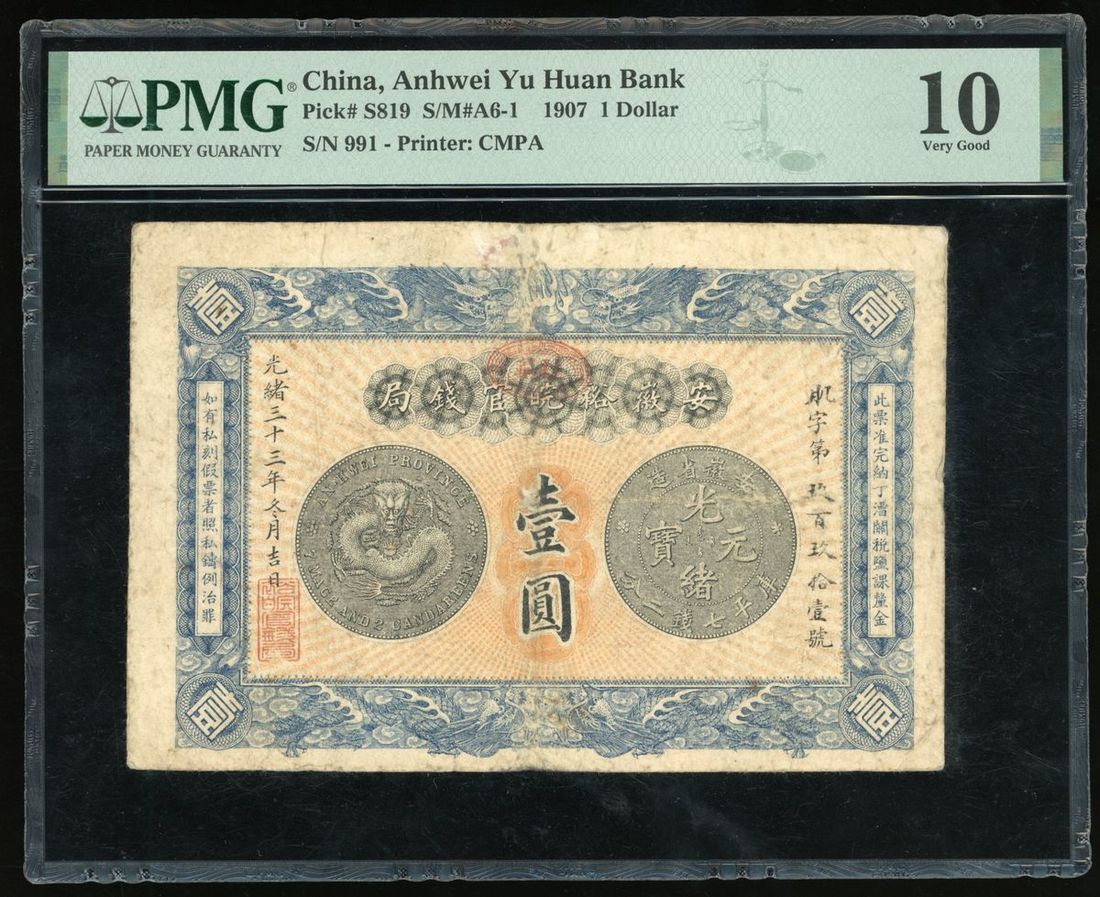 Anhwei Yu Huan Bank, China, 1 yuan, Guangxu Year 33 (1907), serial number 991, with obverse and reverse design of a dragon dollar coin,