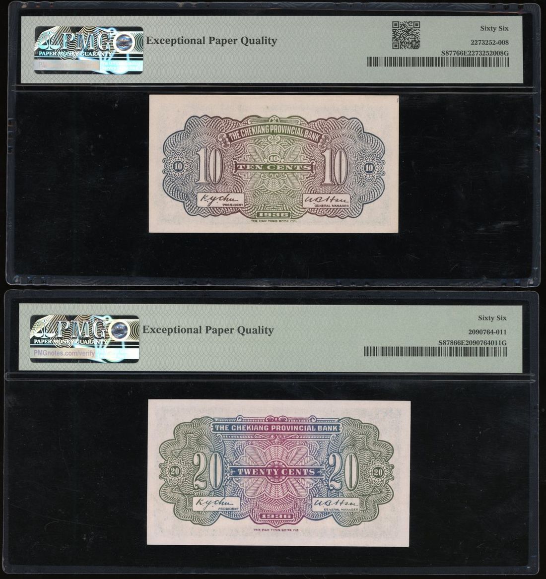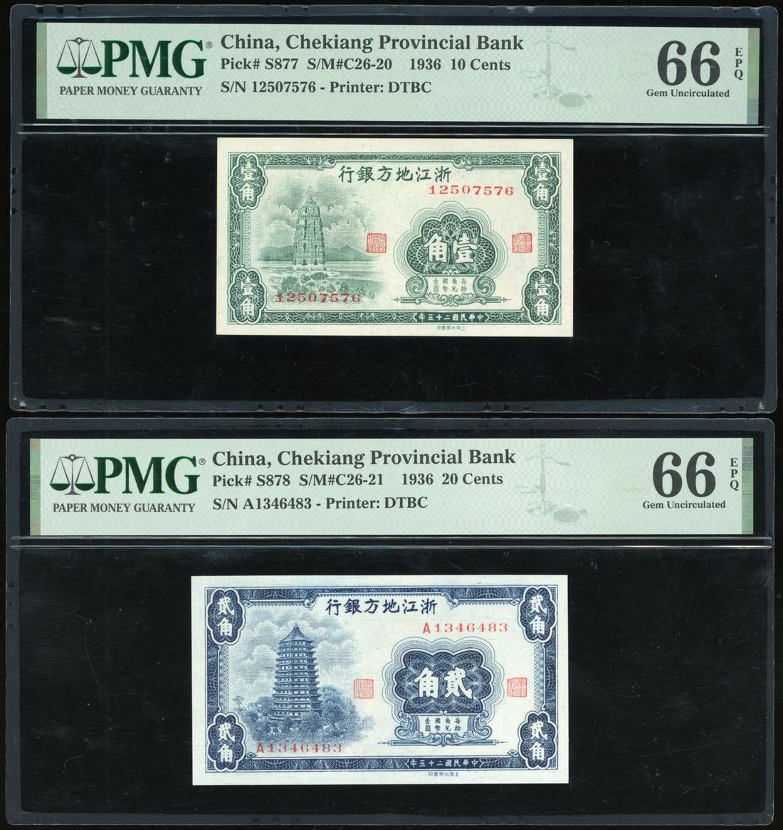 Chekiang Provincial Bank, China, a pair of 10 and 20 cents, Year 25(1936), serial number 12507576 and A1346483, (Pick S877 and S878), both graded PMG 66EPQ Gem Uncirculated (2).