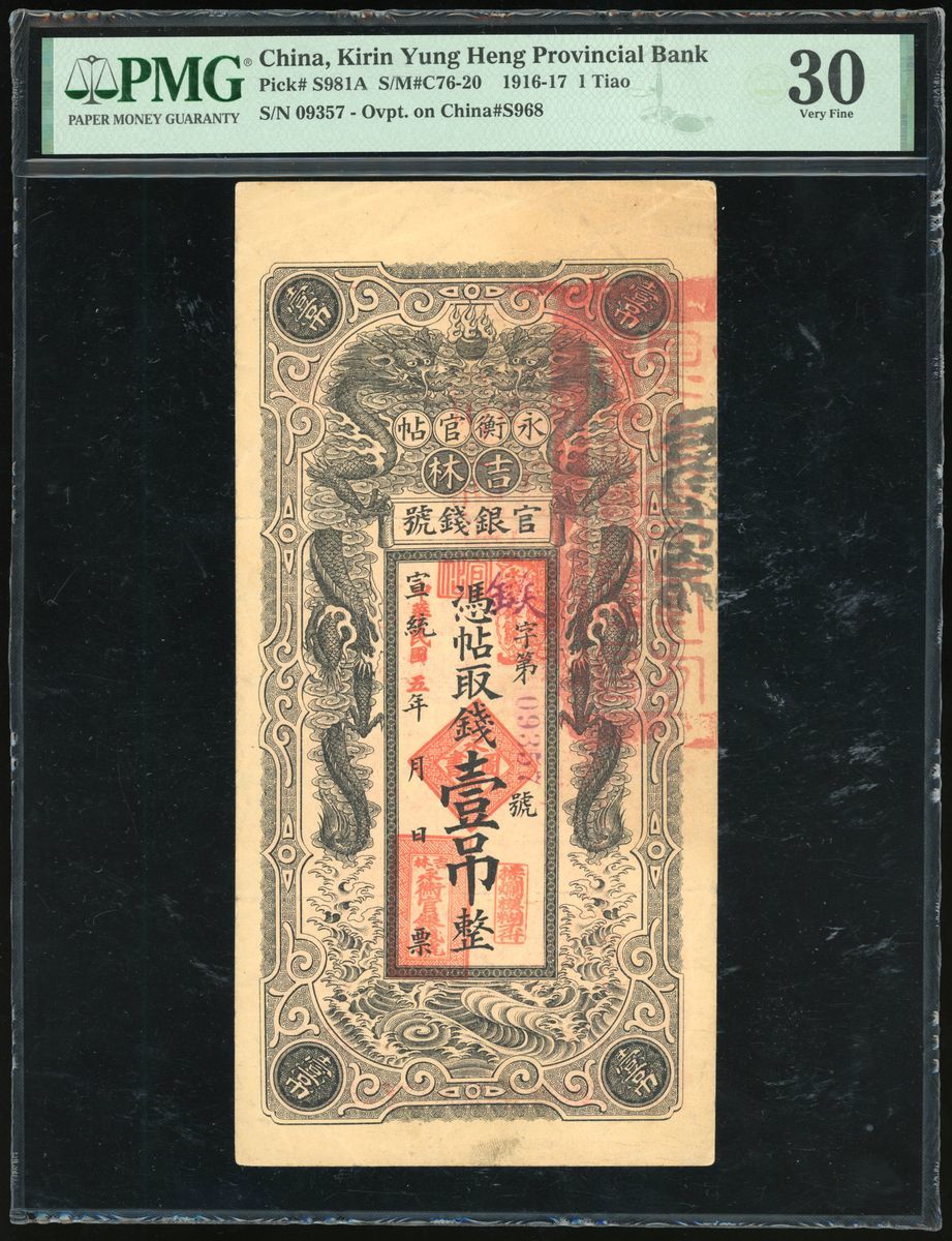 Kirin Yung Heng Provincial Bank, China, 1 tiao, Year 5 (1916), serial number 09357, (Pick S981A), PMG 30