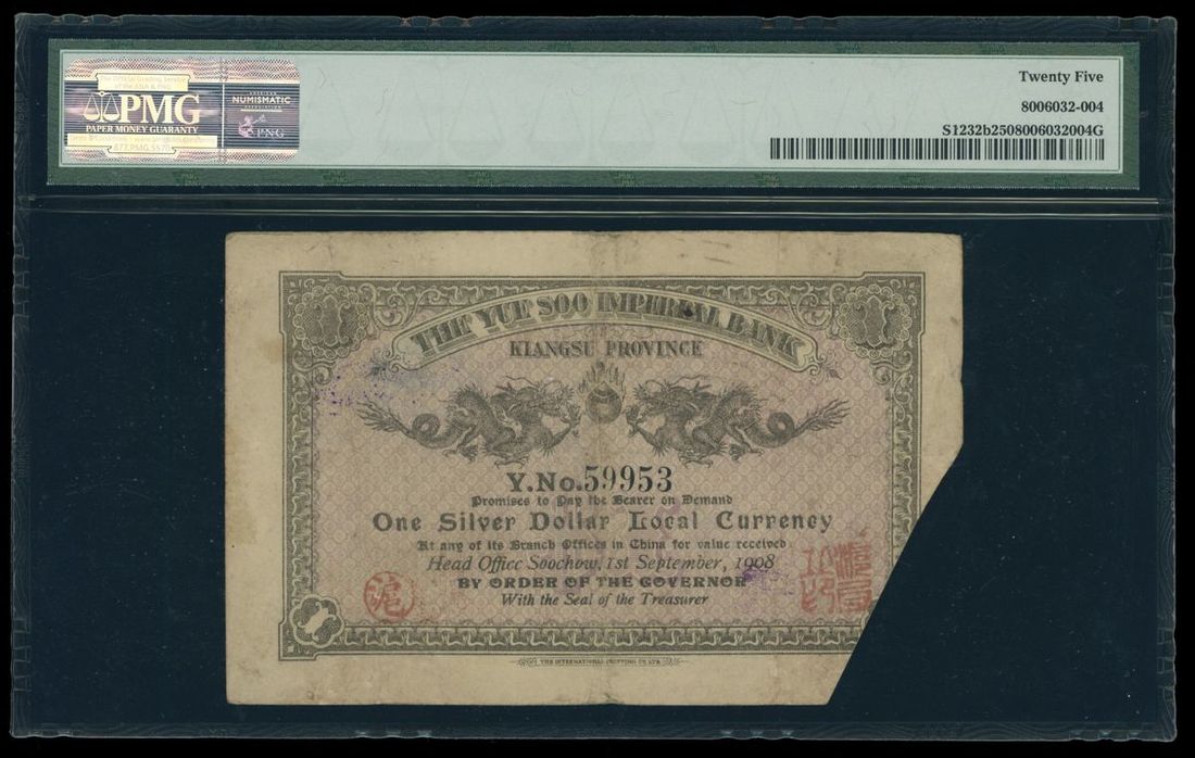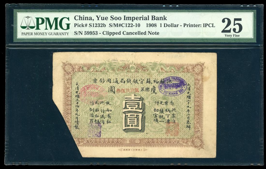 Yue Soo Imperial Bank, Kiangsu Province, China, $1, 1908, serial number 59953, Clipped Cancelled Note, (Pick S1232b), PMG 25 Very Fine, a rare official Qing Dynasty provincial issue, only 4 graded higher at 30 in the PMG population report!