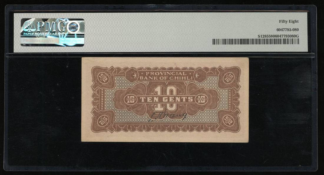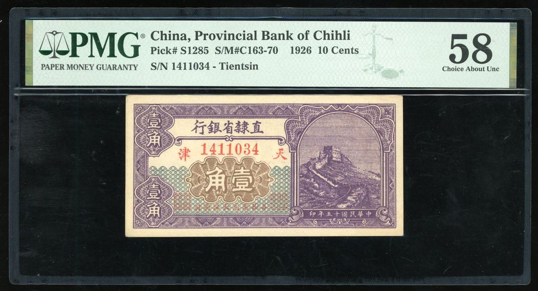 Provincial Bank of Chihli, China, 10 cents, Year 15 (1926), Tientsin, serial number 1411034, (Pick S1285), PMG 58 Choice About Uncirculated, only 1 note graded higher in the PMG population report