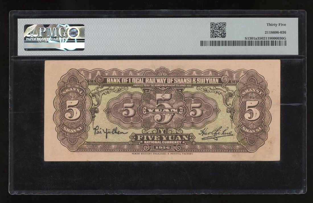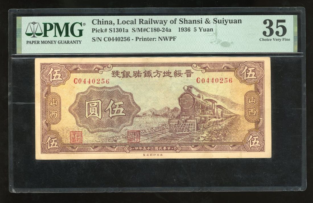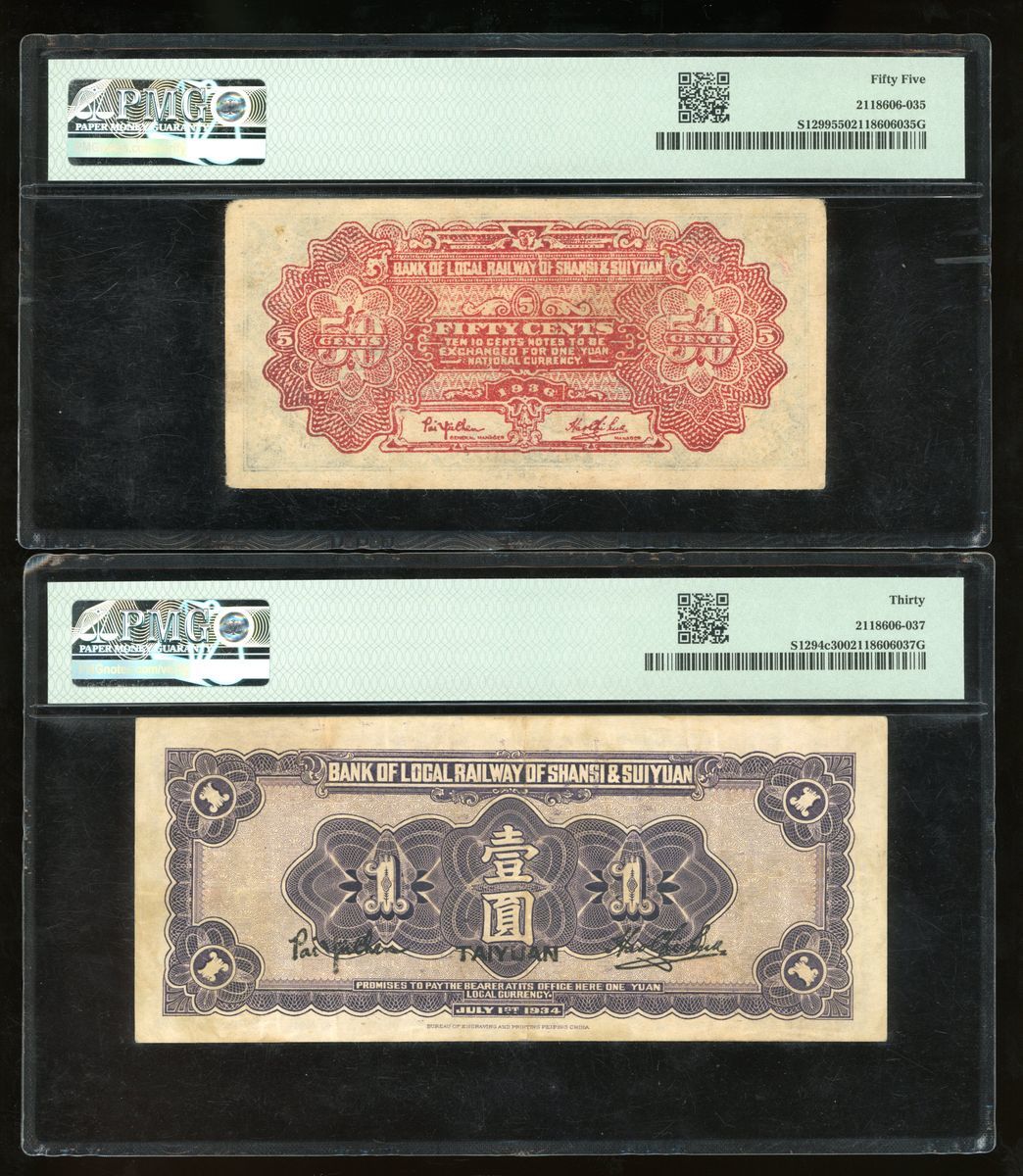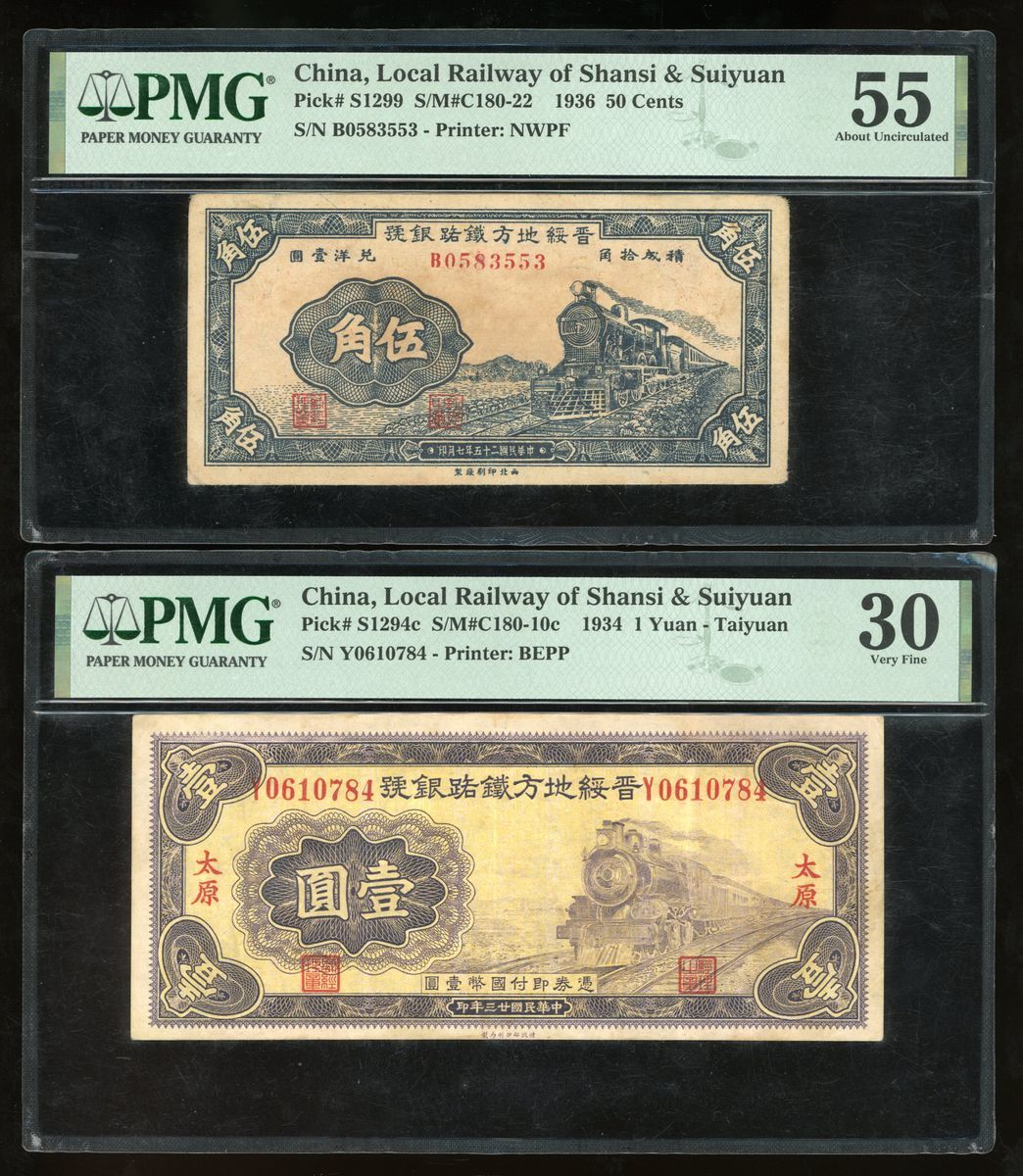 (x) Local Railway of Shansi & Suiyuan, China, a group of 3x, including 1 yuan 1934, 50 cents 1936 and 5 yuan 1935, (Pick S1294c, S1299, S1301a), PMG 30, 55, 35 respectively (3)