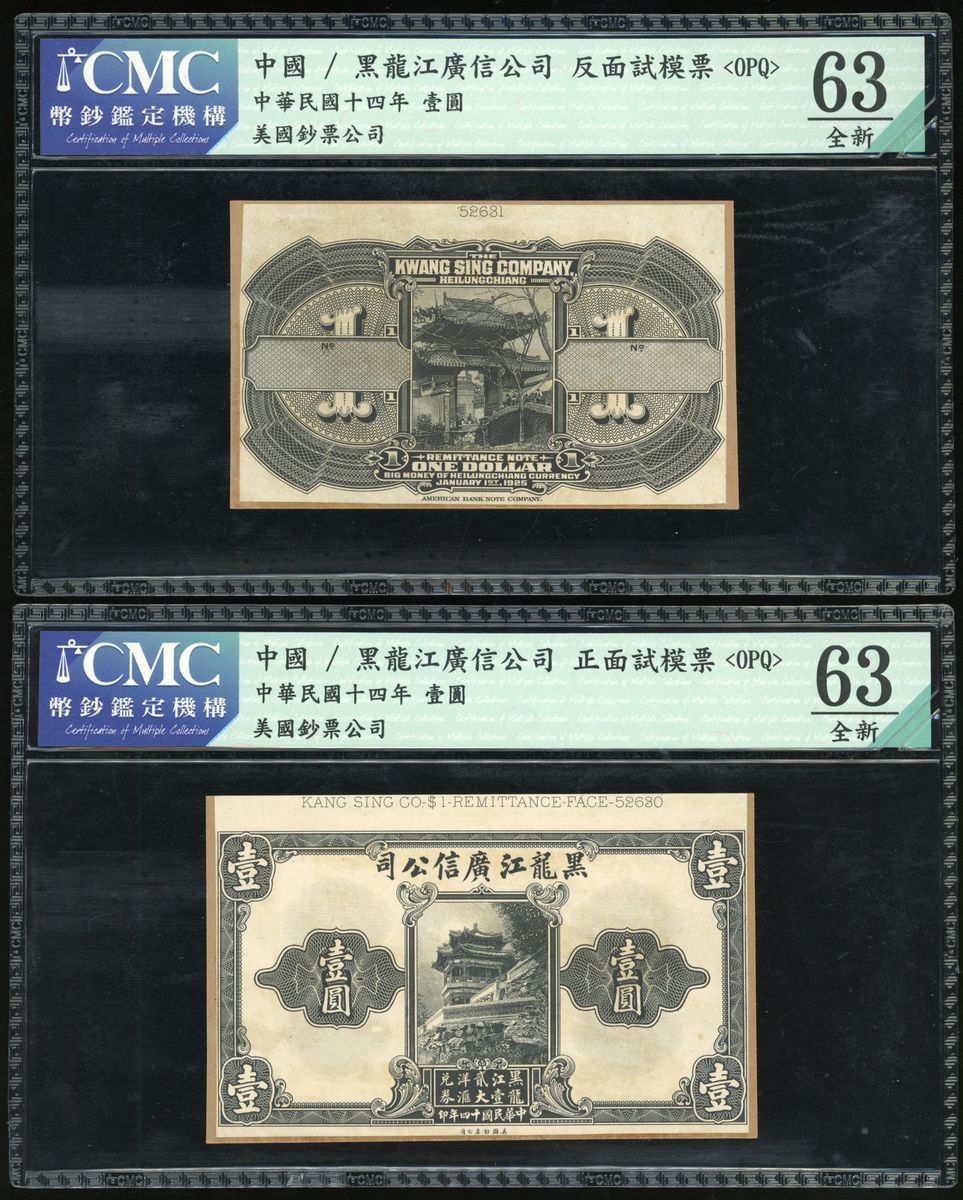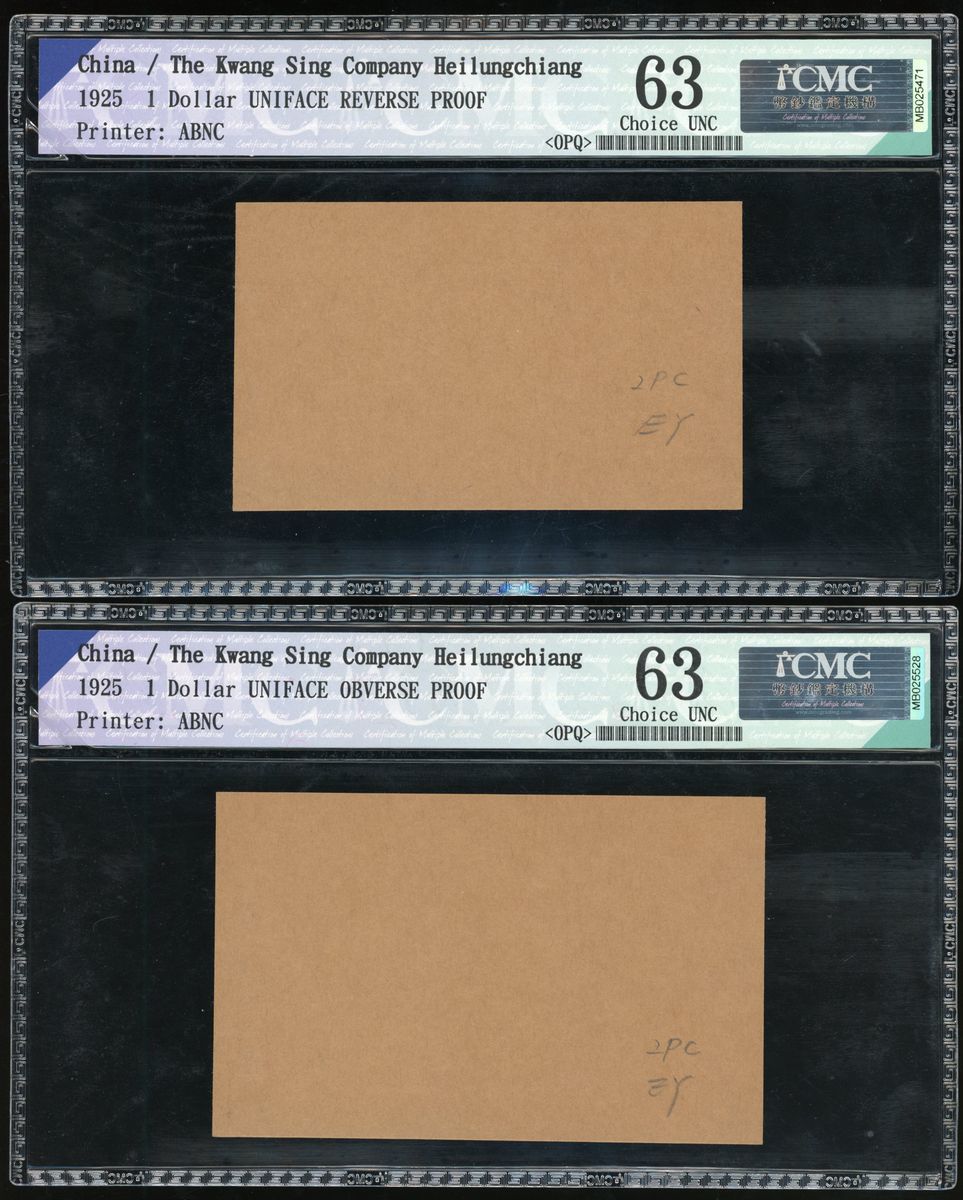 Kwang Sing Company, Heilungkiang, China, a pair of uniface obverse and reverse proof on card for 1 dollar, Year 14(1925), printed by ABNC, control numbers 52630 and 52631, black and white,