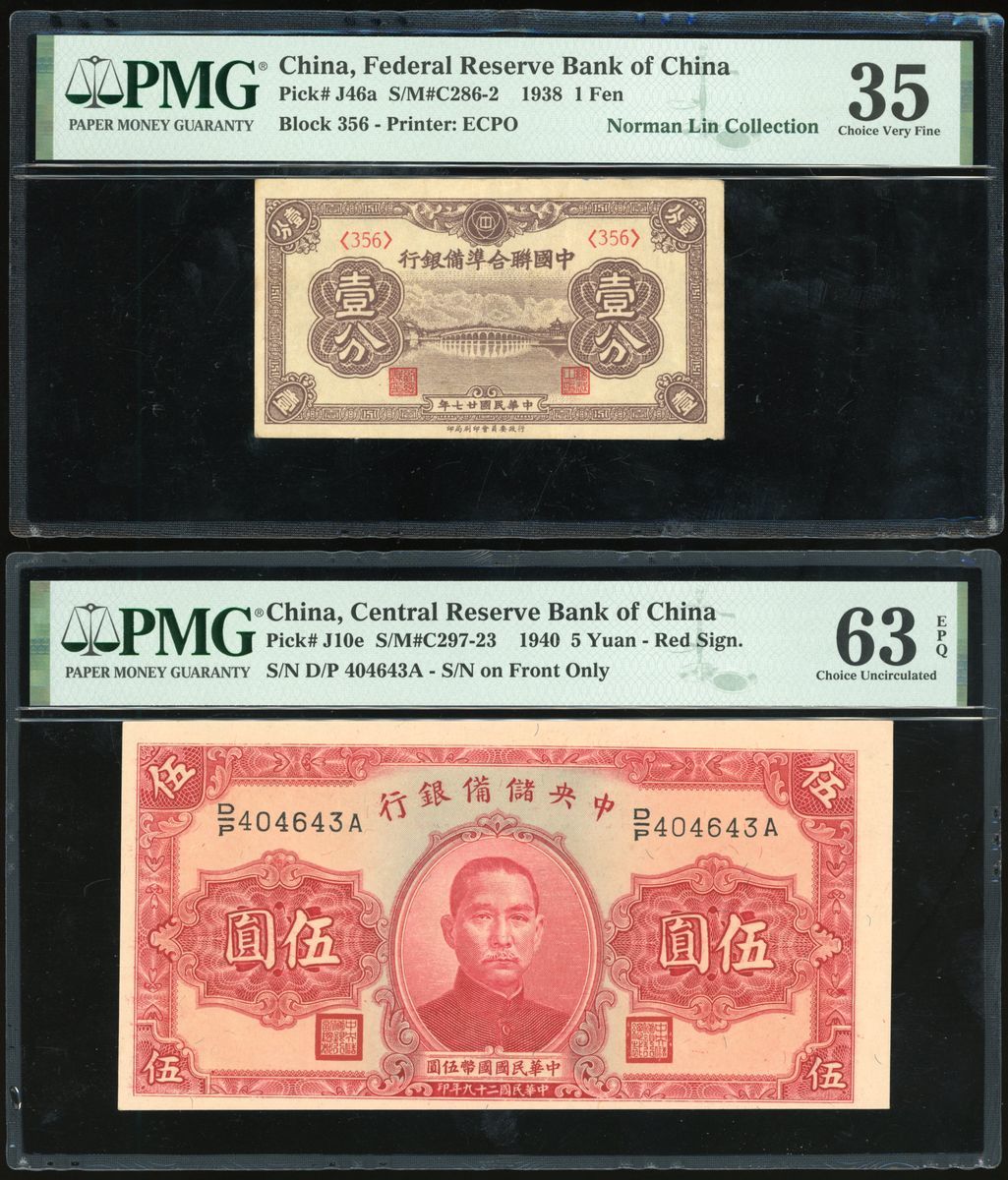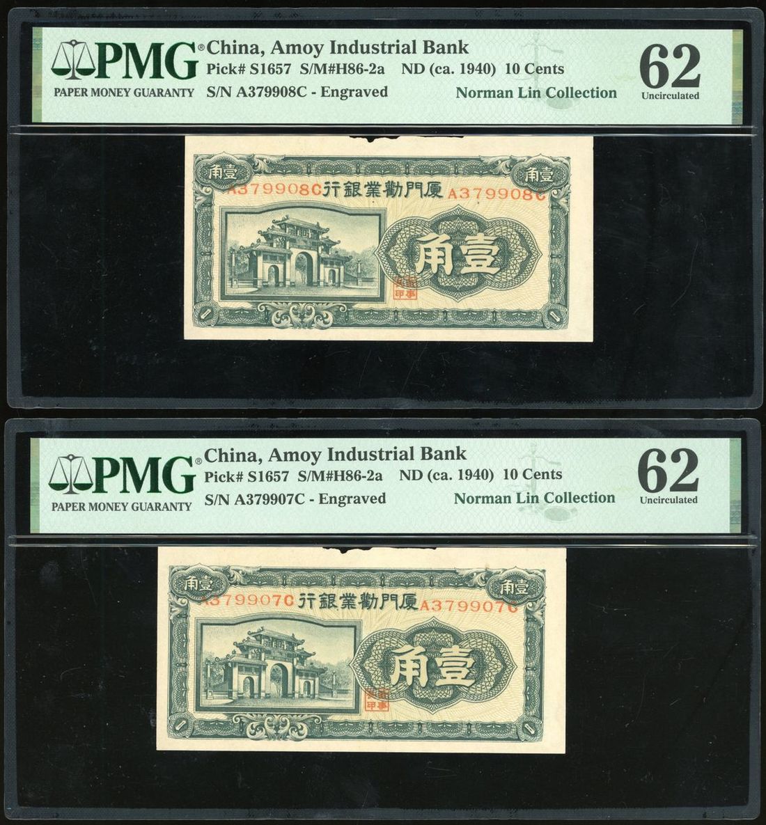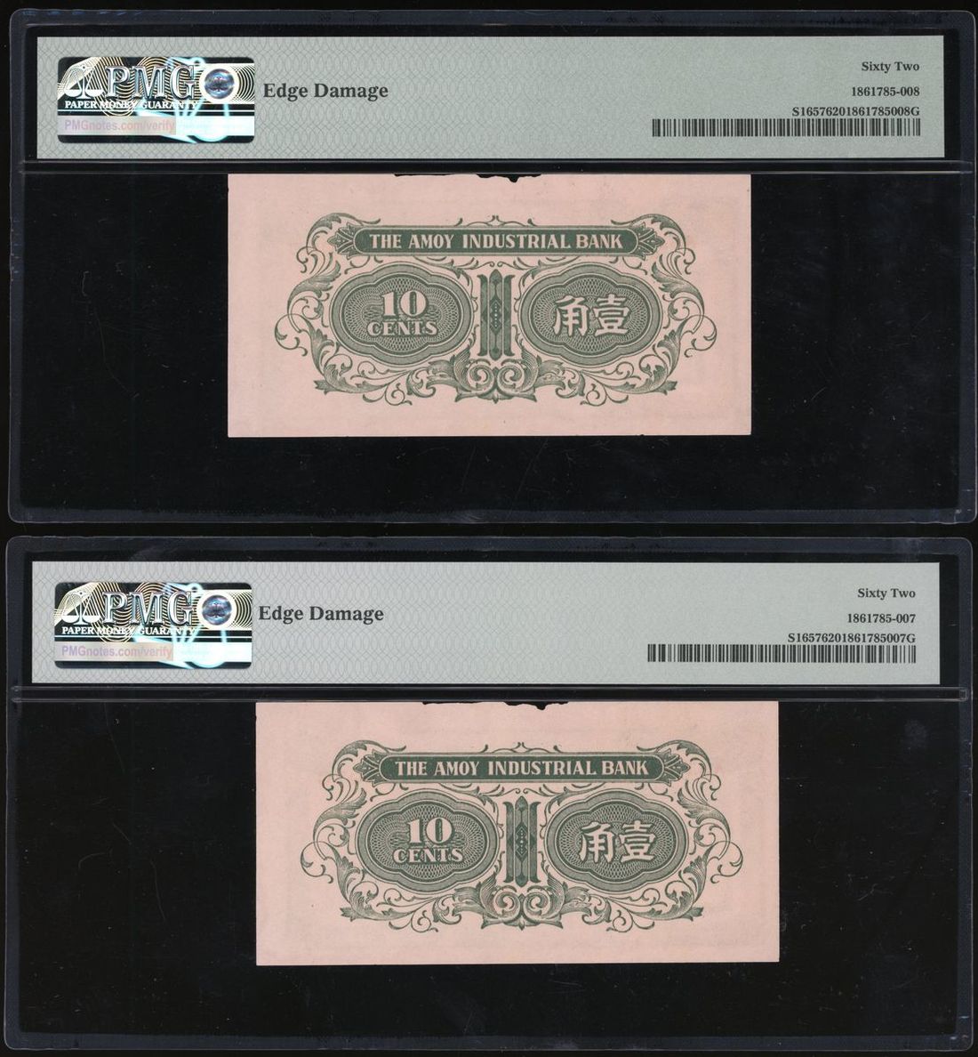 Amoy Industrial Bank, China, a consecutive pair of 10 cents, no date (ca. 1940), also with Federal Reserve Bank of China, 1 fen, Year 27(1938), and Central Reserve Bank of China, 5 yuan, Year 29(1940), serial numbers A379907-08C, block 356 and D/P 404643A, (Pick S1657, J46a and J10e), graded PMG 62(Edge Damage), 62(Edge Damage), 35 and 63EPQ respectively, all from Norman Lin Collection (4)