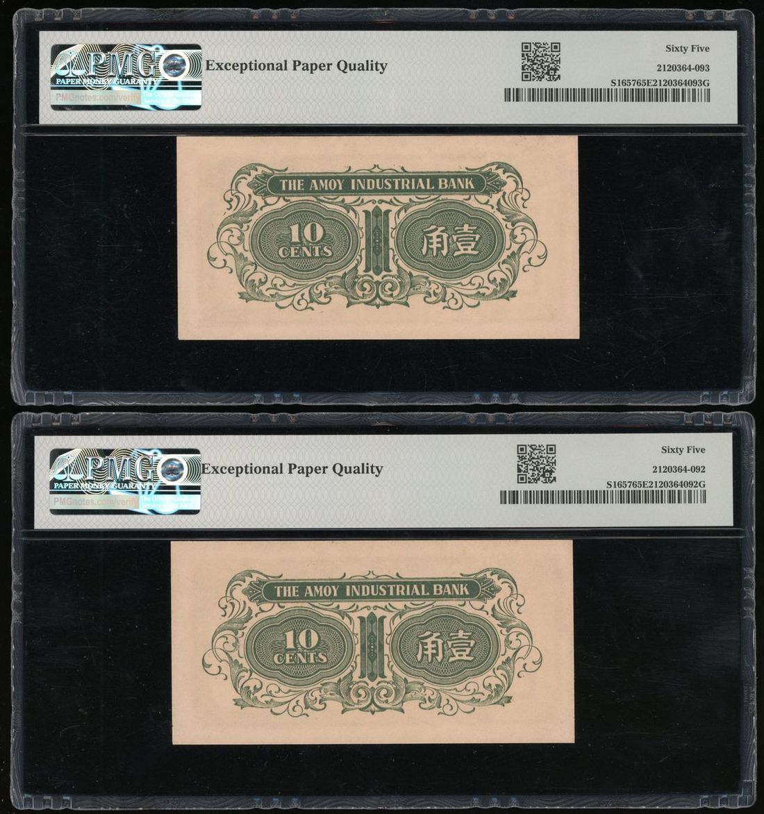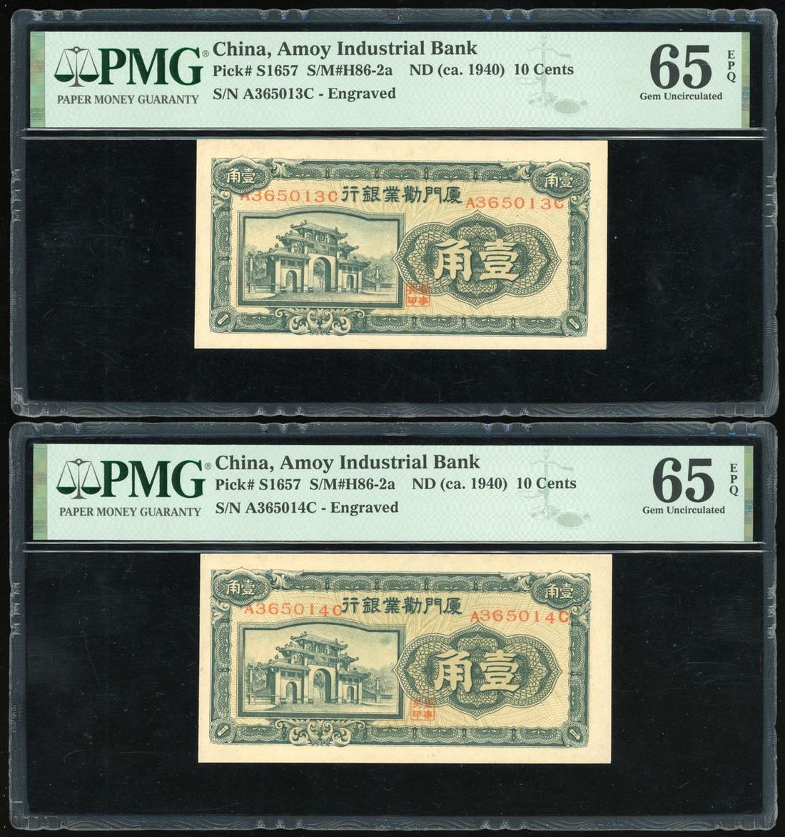 Amoy Industrial Bank, China, a pair of 10 cents, ND (1940), serial number A365013C, A365014C, (Pick S1657), PMG 65EPQ, Gem Uncirculated