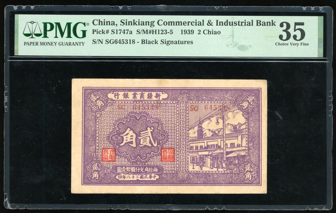 Sinkiang Commercial & Industrial Bank, China, 2 chiao, Year 28(1939), serial number SG645318, black signature,