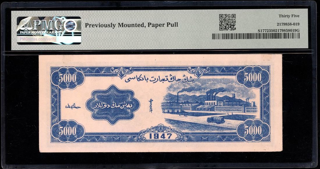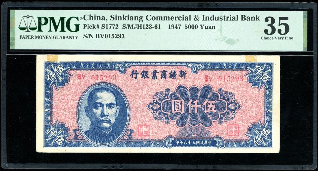 Sinkiang Commercial & Industrial Bank, China, 5000 yuan, Year 36(1947), serial number BV015293, (Pick S1772), PMG 35 Choice Very Fine (Previously Mounted, Paper Pull).