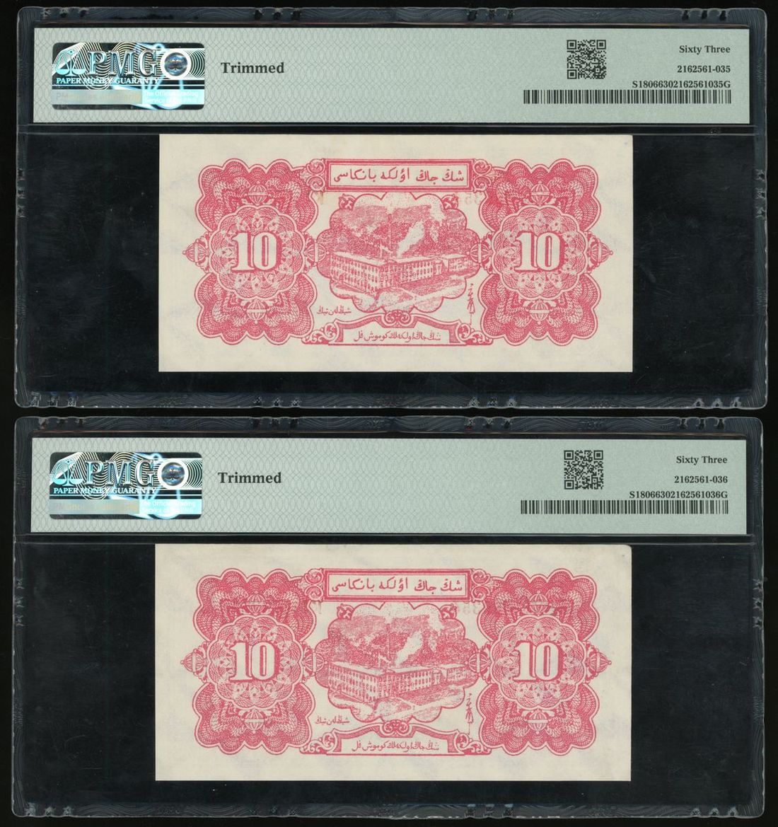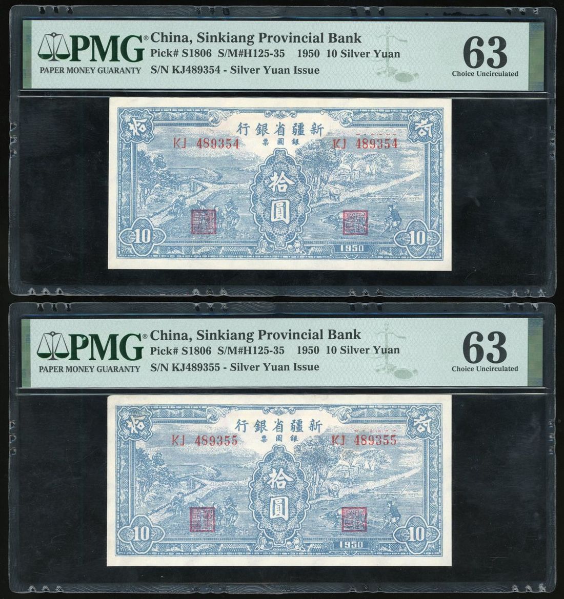 Sinkiang Provincial Bank, China, consecutive pair of 10 silver yuan, 1950, serial number KJ489354-5 (Pick S1806), both PMG 63 Choice Uncirculated, trimmed (2)