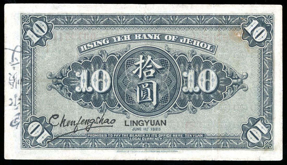 Hsing Yeh Bank of Jehol, China, 10 yuan, Lingyuan, Year 12(1923), serial number 0070541, (Pick S2185c), extremely fine, mild stain at edges and annotation at reverse