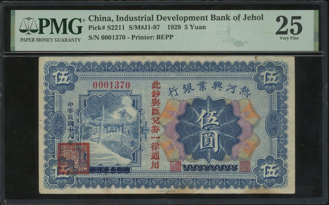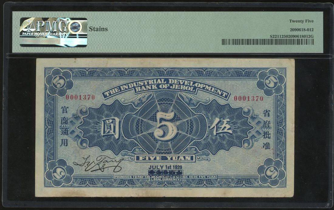 Industrial Development Bank of Jehol, China, 5 yuan, Year 18(1929), serial number 0001370, (Pick S2211), PMG 25 Very Fine (Stains), the highest grade in PMG population report.