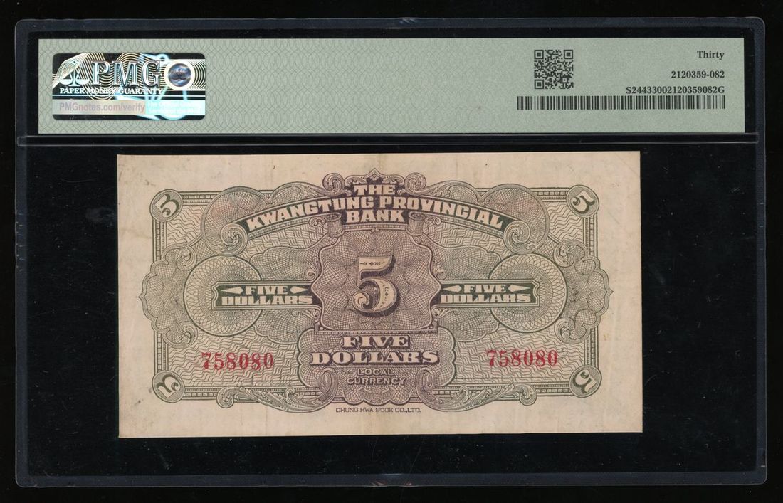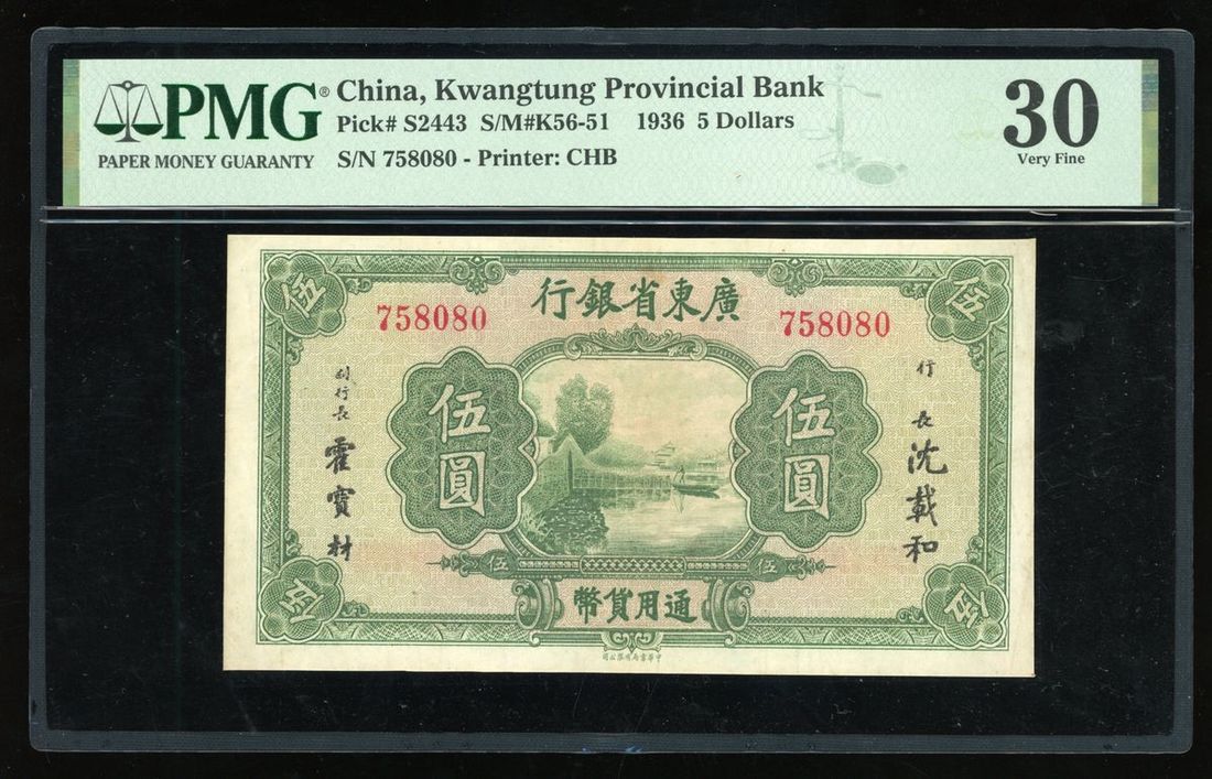 Kwangtung Provincial Bank, China, 5 yuan, ND (1936), serial number 758080, (Pick S2443), PMG 30 Very Fine