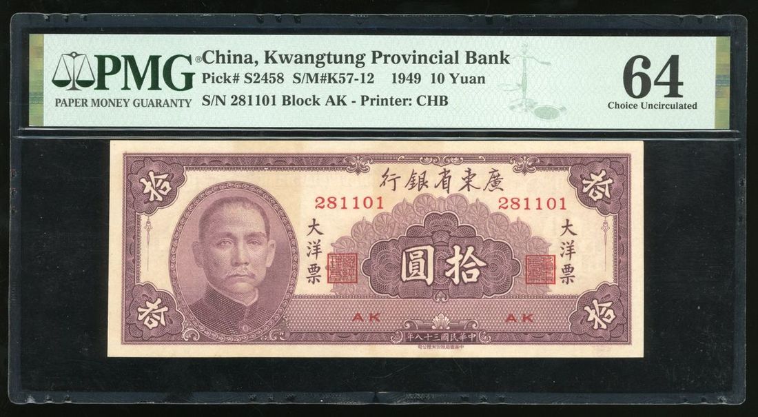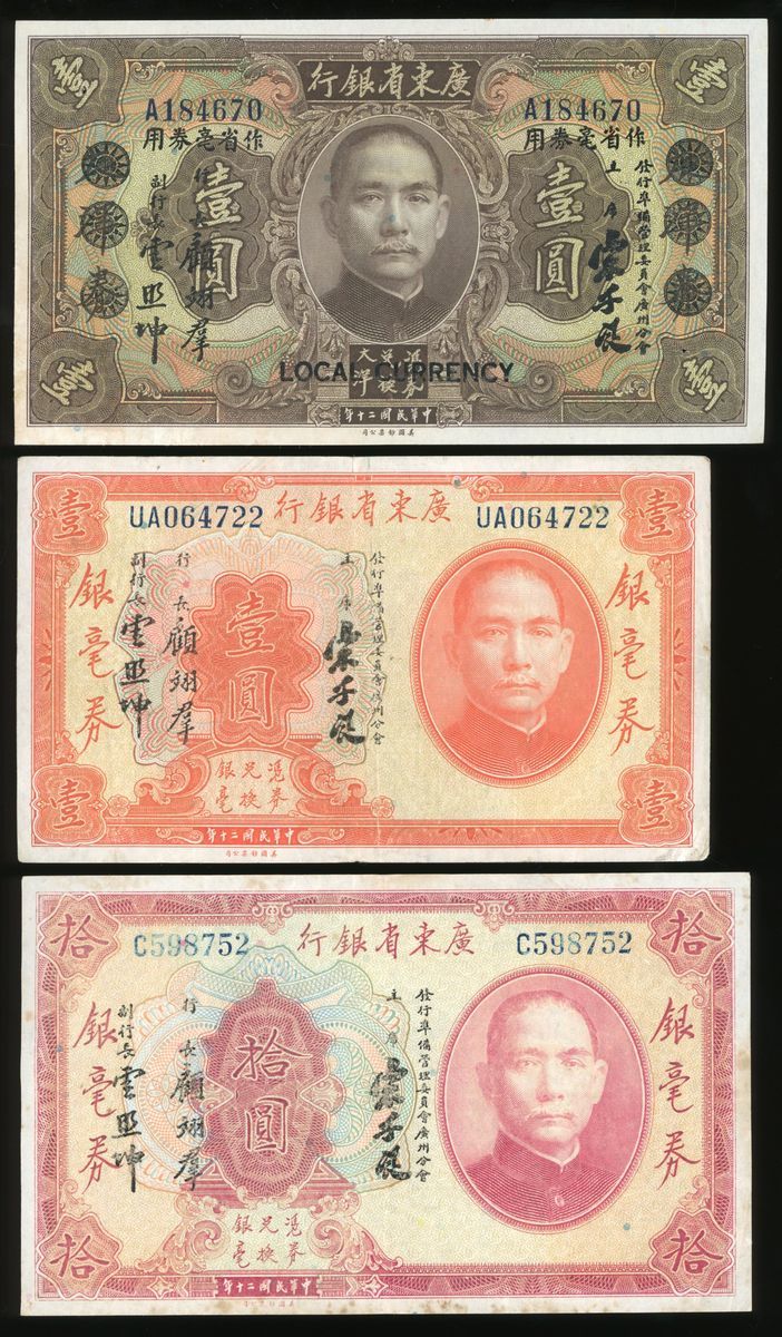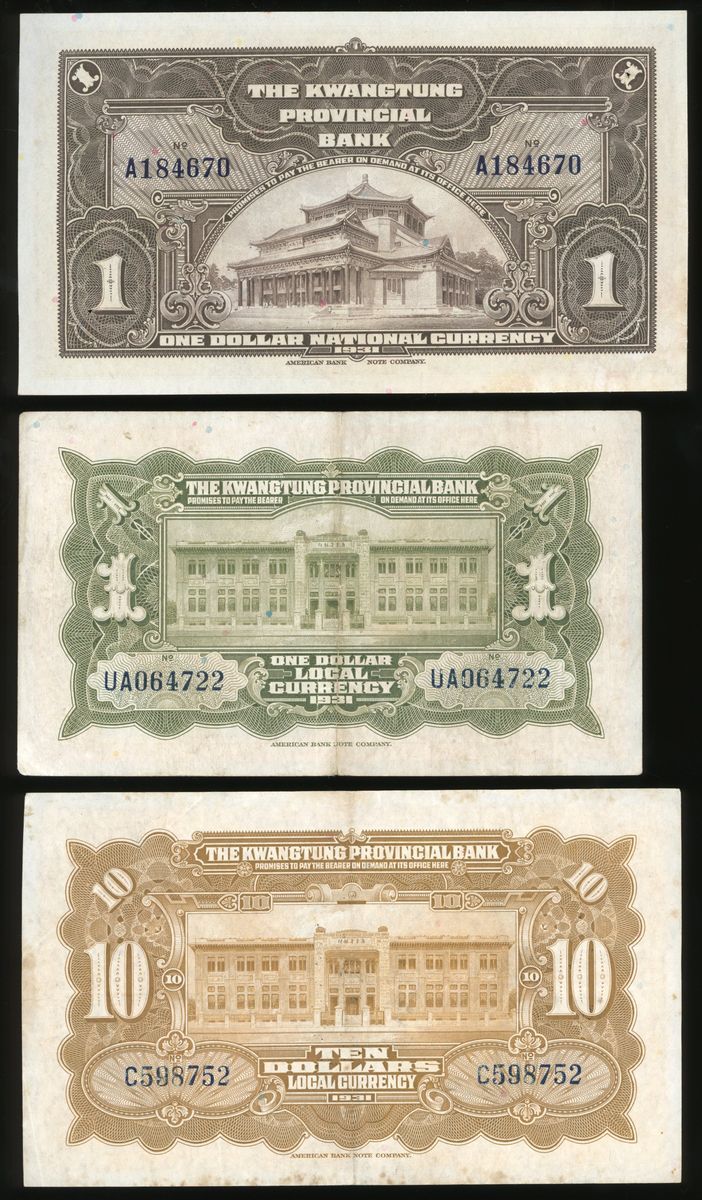 Kwangtung Provincial Bank, China, a group of 4x, including: 10 yuan, 1949; $1, 1931; $1, 1931; $10, 1931; serial numbers 281101, A184670, UA064722 and C598752;